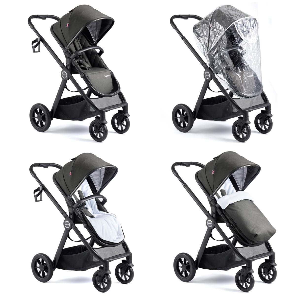Luxury 3 in 1 travel system bundle includes: Chassis, Seat, Elevator, Carrycot, Universal Car Seat Adaptors, Footmuff, Seat Liner, Rain Cover, Changing Bag, Changing Mat, Cup Holder, Coco i-Size Car Seat.