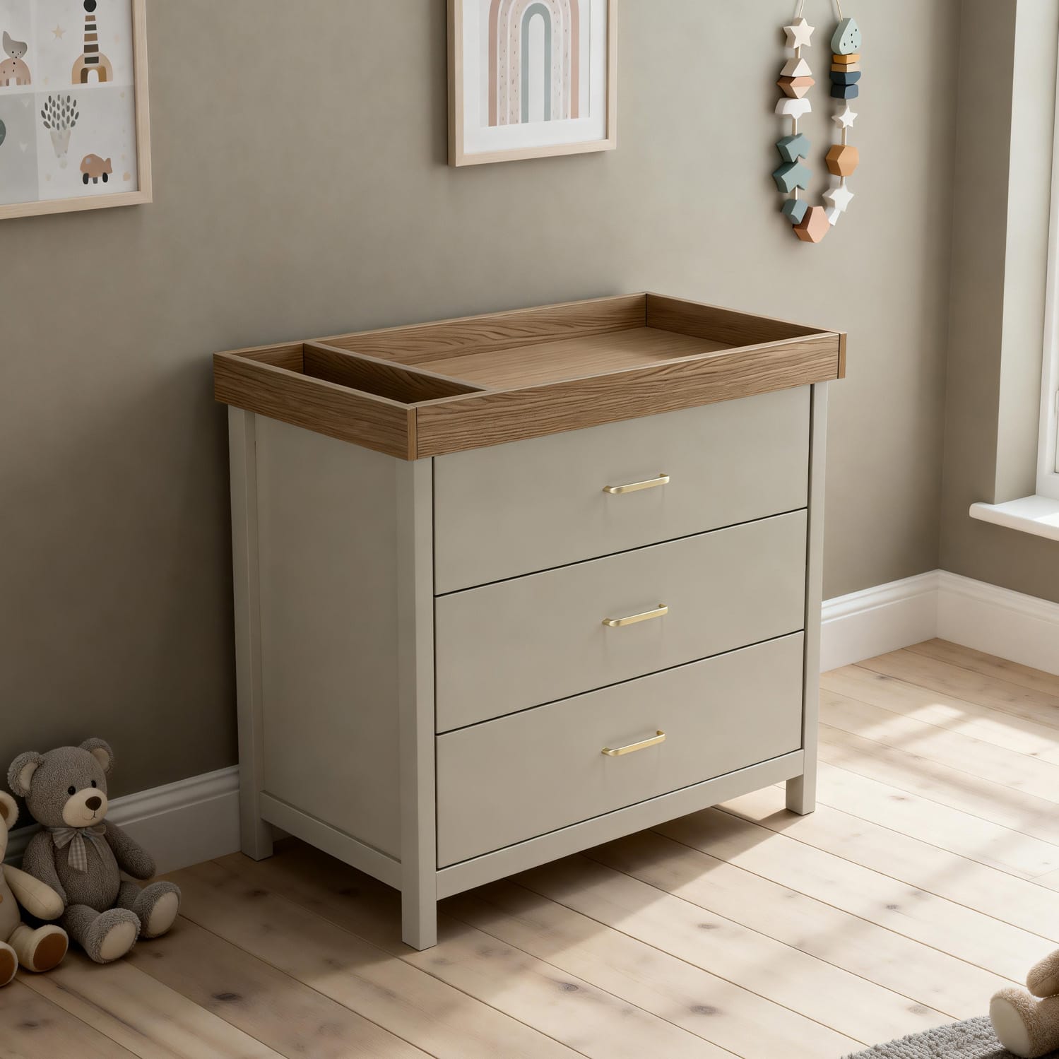 The Mira furniture collection fills your nursery with a serene, airy calm. Wrapped in soft cashmere and enriched with natural oak accents and brushed handles, it creates the dreamiest neutral nursery – harmonious, warm, and effortlessly refined. Create a soothing, clutter-free nursery with the Mira Chest Changer. Soft-close drawers add to the tranquil feel, whilst protecting tiny fingers and keeping the nursery peaceful during nap times. As your baby grows, the removable changing top allows the Mira Chest to easily transition into a classic chest of drawers from around 12 months onwards, making it a practical piece that will last for years. With three spacious, full-sized drawers, there’s ample room to store clothing, nappies, and all your baby’s everyday essentials.