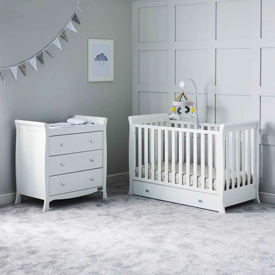 Ickle Bubba Snowdon 4 in 1 Mini Cot Bed and Changing Unit includes the 4 in 1 Mini Cot Bed and full-size Changing Unit. These pieces have a distinctive and traditional sleigh design, and they are perfect for the space conscious parent.. Designed with three height positions, the top position is ideal for your baby to be taken in and out of the cot bed, without any unnecessary bending and is suitable from birth to approximately 6 months. When your baby is learning to sit and stand, the mattress base can then be lowered by a further two positions, providing extra security and reassurance.
