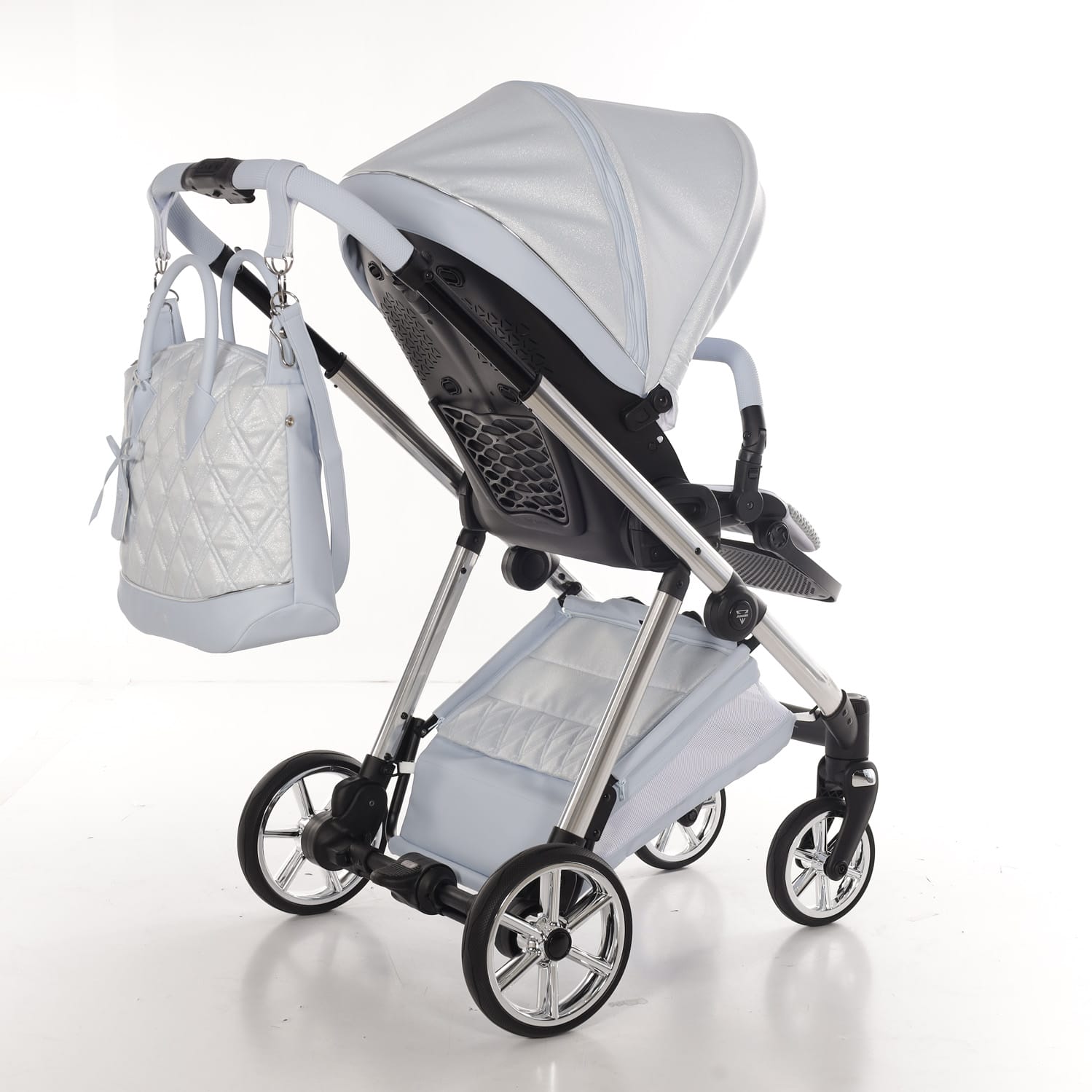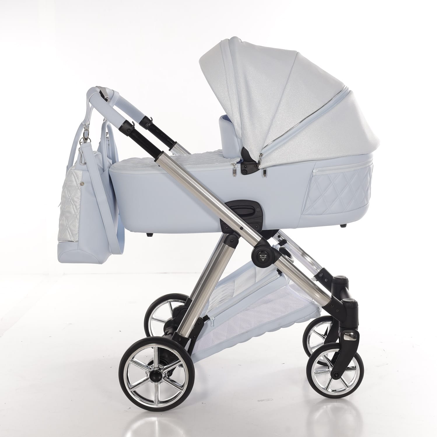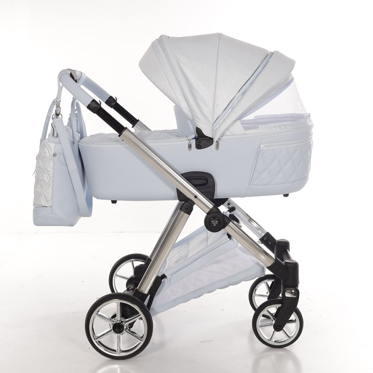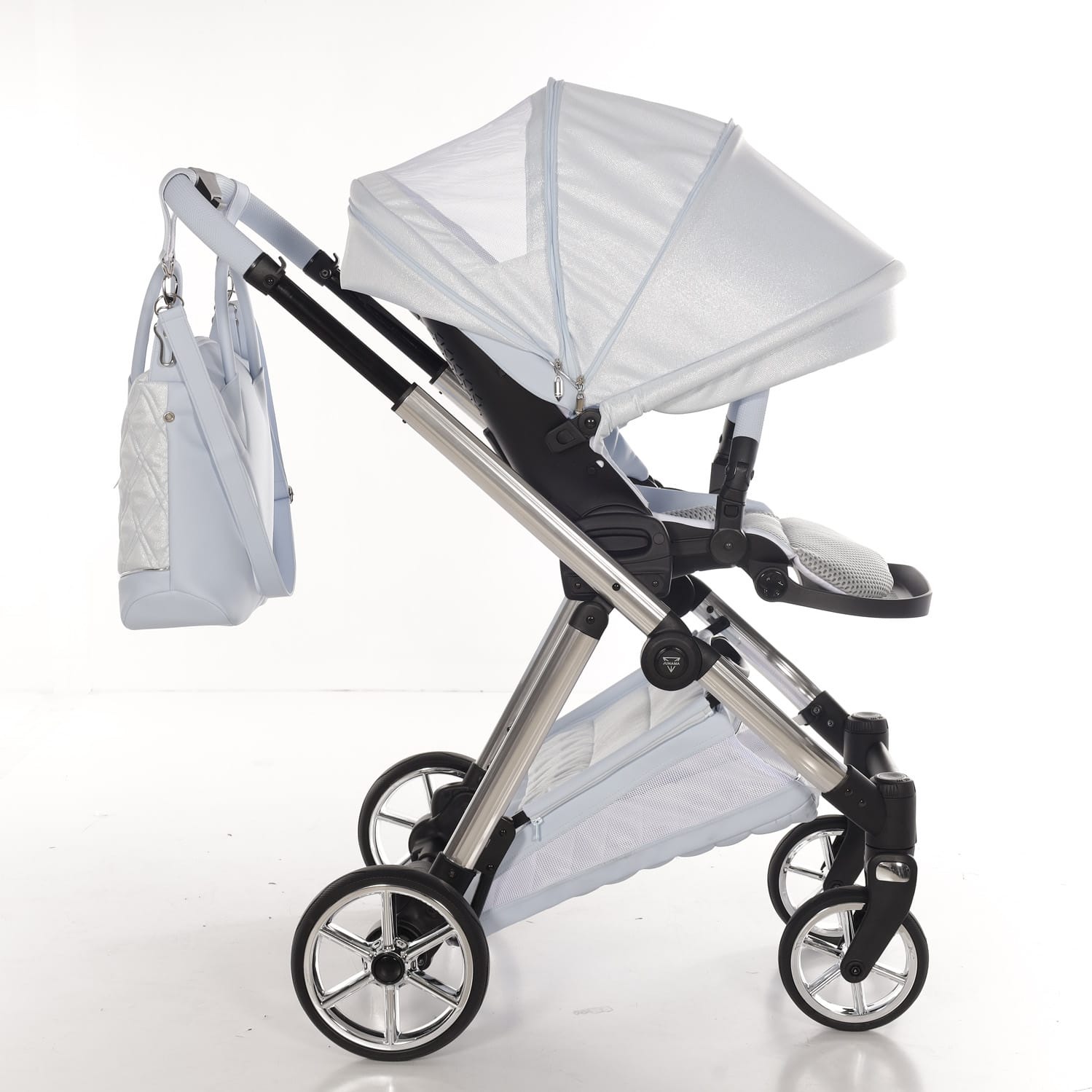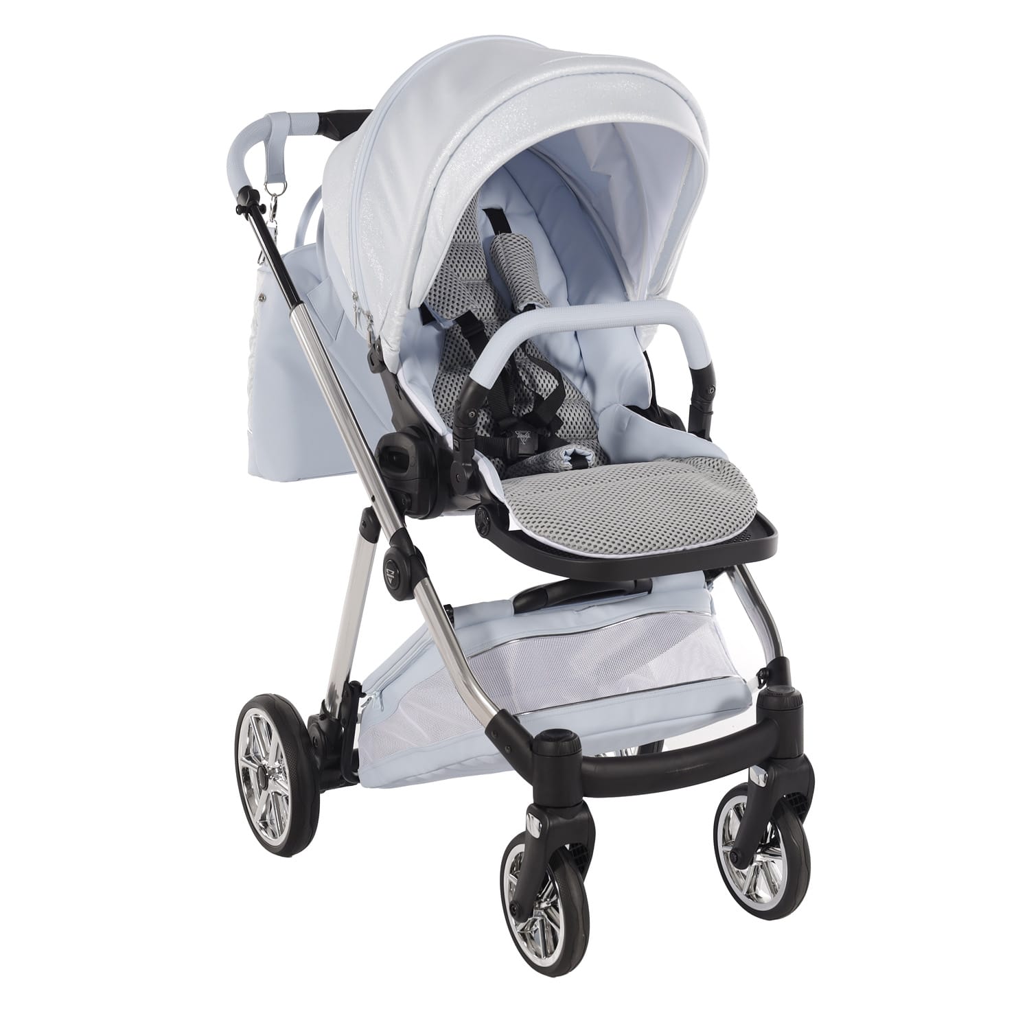 The aluminium chassis comes with superb suspension, large shopping basket and quick release wheels. Engineered with shock breakers which make the pram extra comfortable and smooth. The reliable front suspension release system absorbs shocks from the ground and frontal blows, for example when hitting the curb. The chassis is engineered with a separate adjustable shock absorber, ensuring agile steering on all terrains.