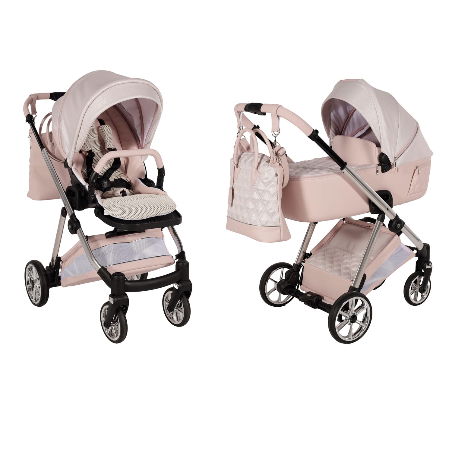 The aluminium chassis comes with superb suspension, large shopping basket and quick release wheels. Engineered with shock breakers which make the pram extra comfortable and smooth. The reliable front suspension release system absorbs shocks from the ground and frontal blows, for example when hitting the curb. The chassis is engineered with a separate adjustable shock absorber, ensuring agile steering on all terrains.