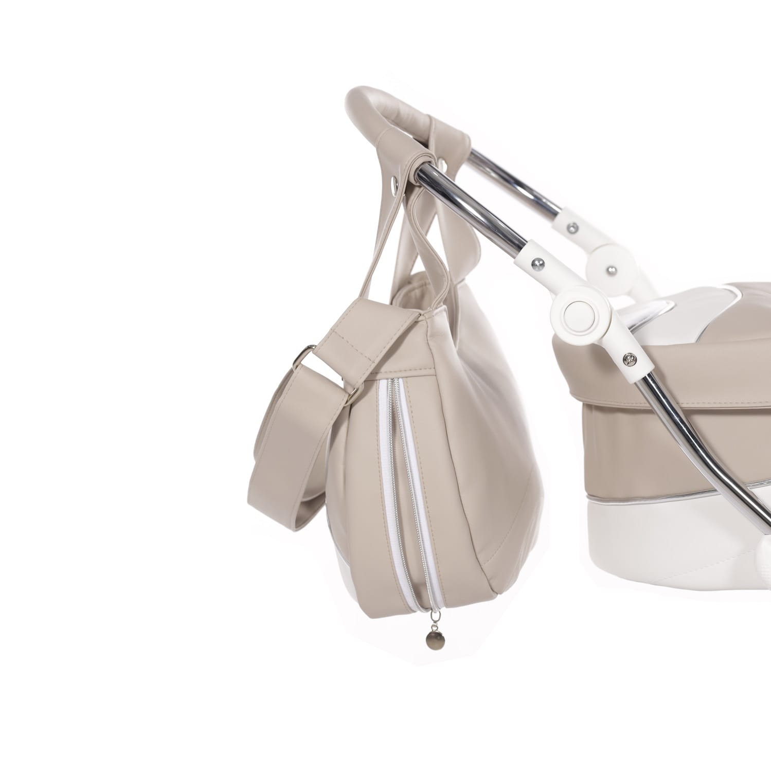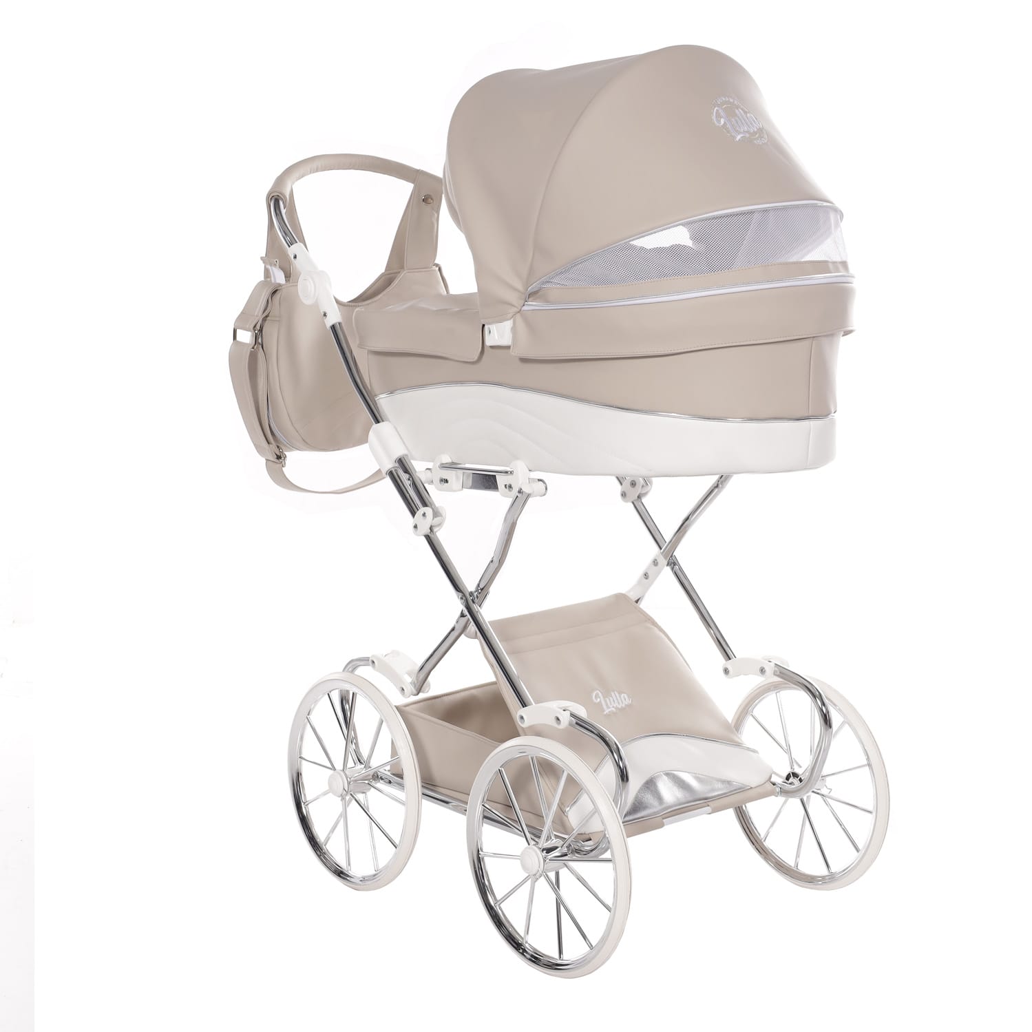 The chassis has sprung suspension and an adjustable-height handle, for super-comfortable pushing. The carrycot comes off, the chassis folds and the wheels can be removed for storage. The pram comes with a matching mini changing bag which can be attached to the chassis. There is a storage basket underneath for extra storage. A beautiful doll’s pram your family can pass down for generations