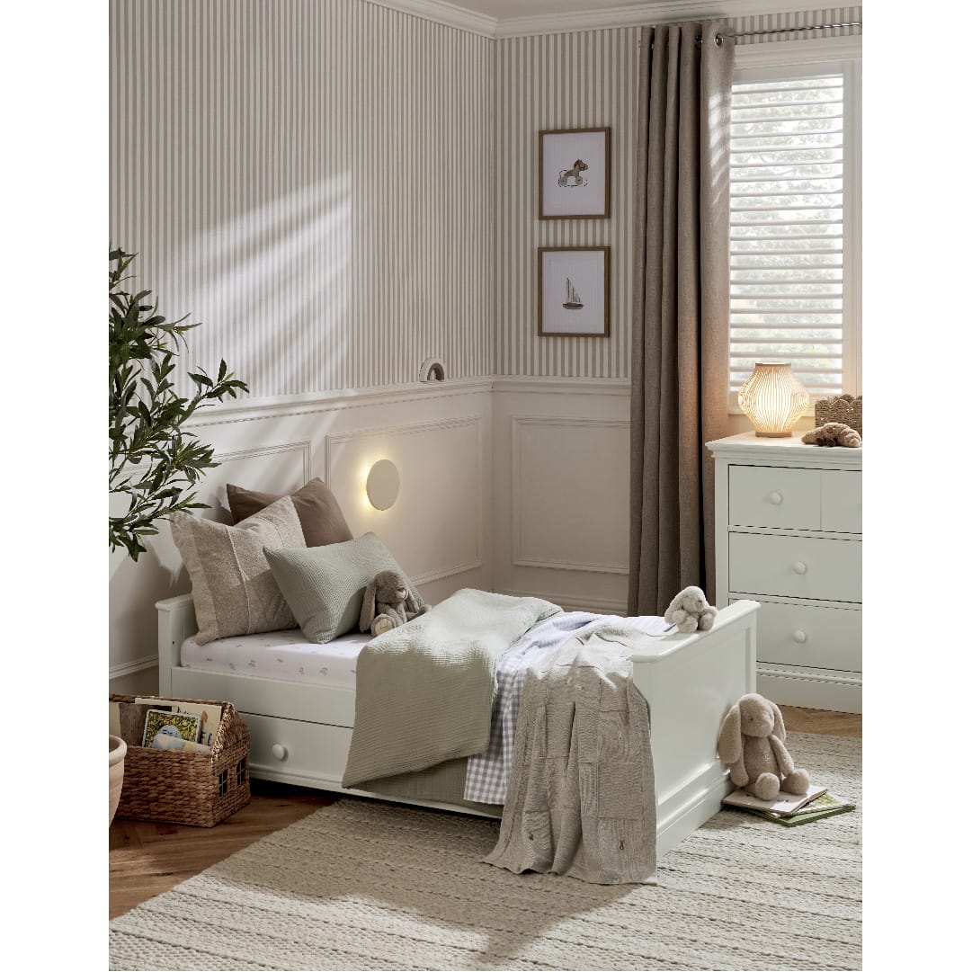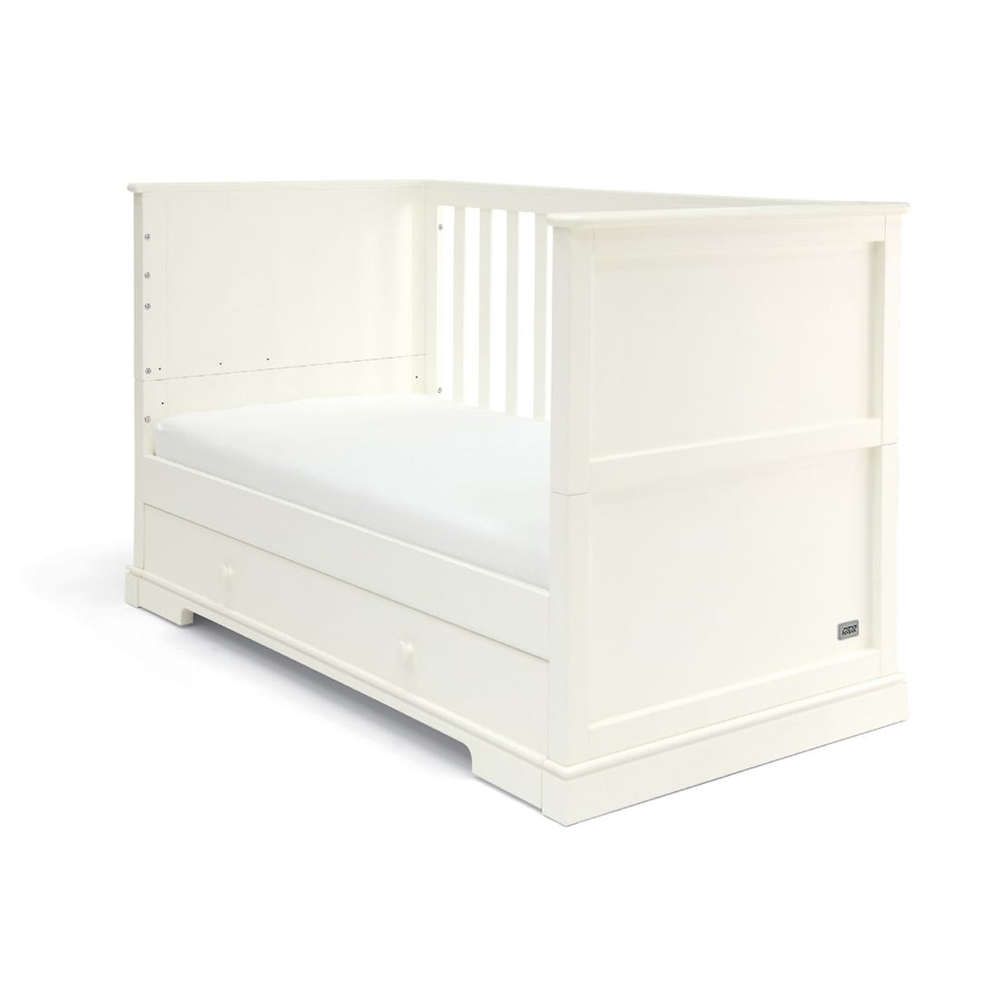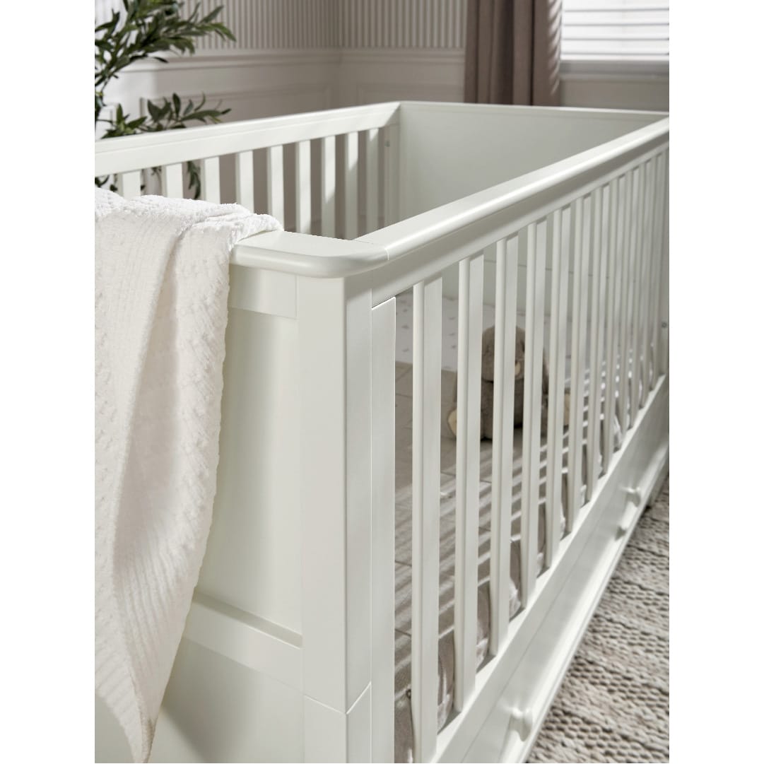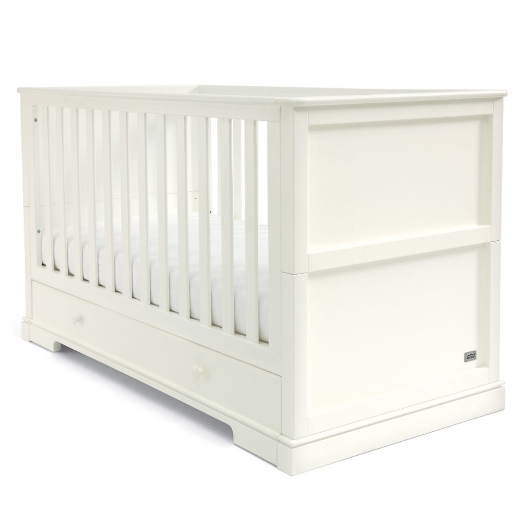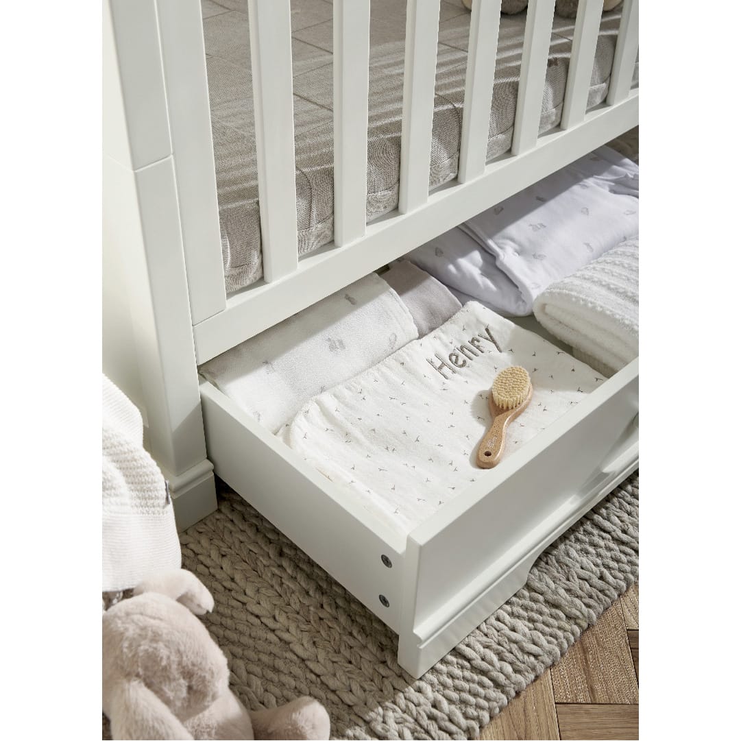 The white cot converts into a day and toddler bed to extend its use. Store bedding and other essentials in the under-bed, soft close drawer.