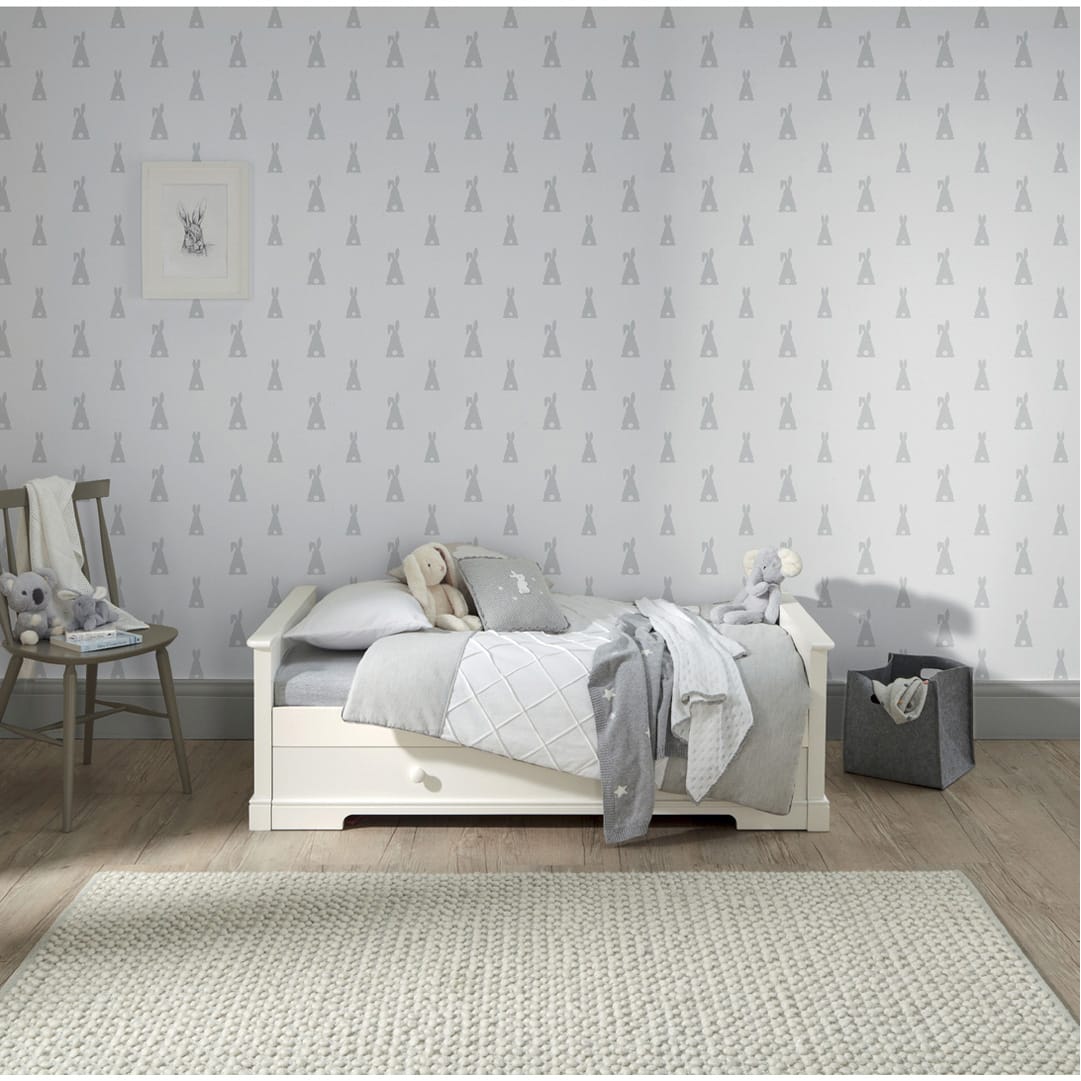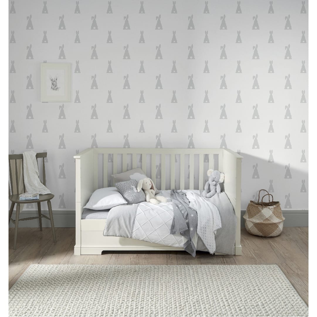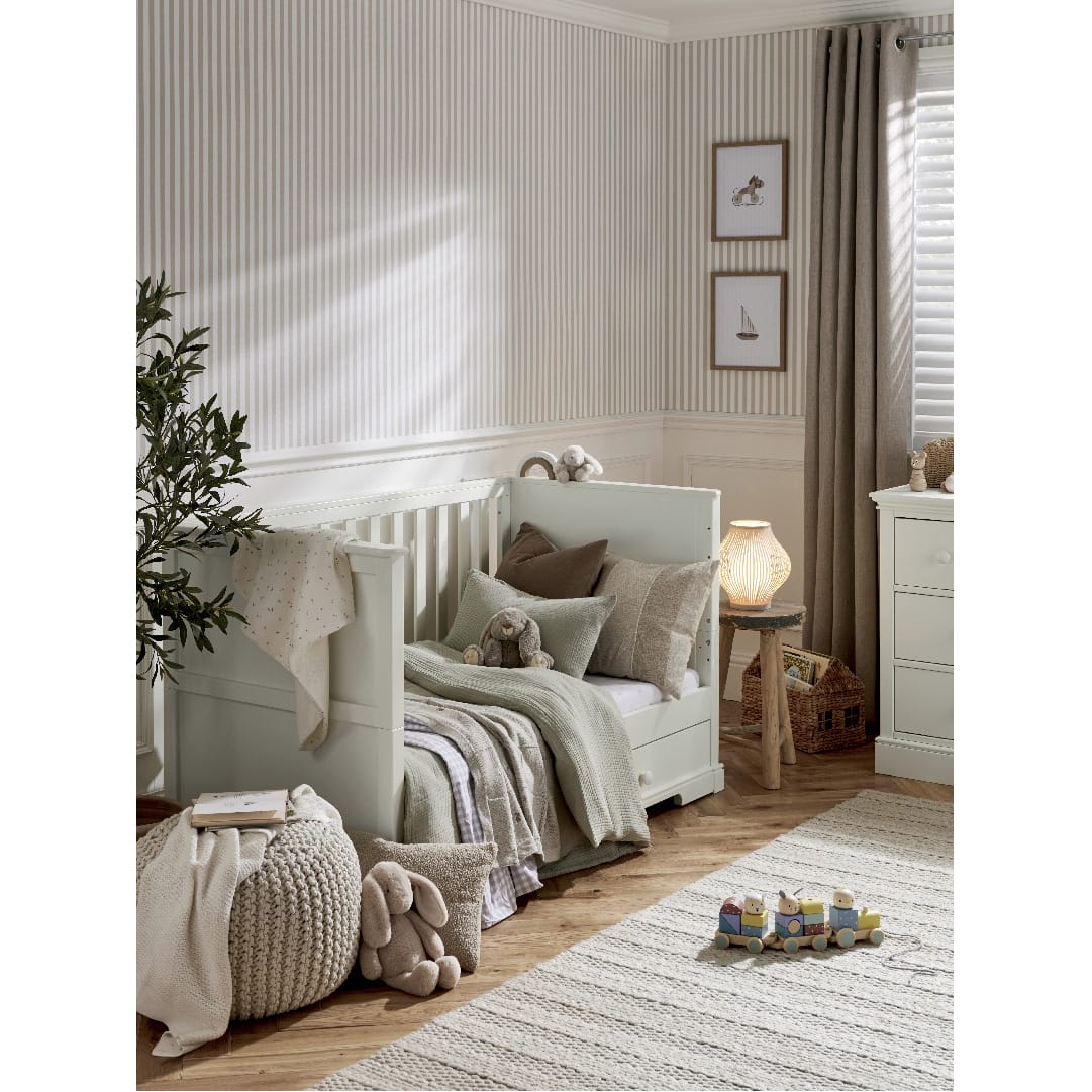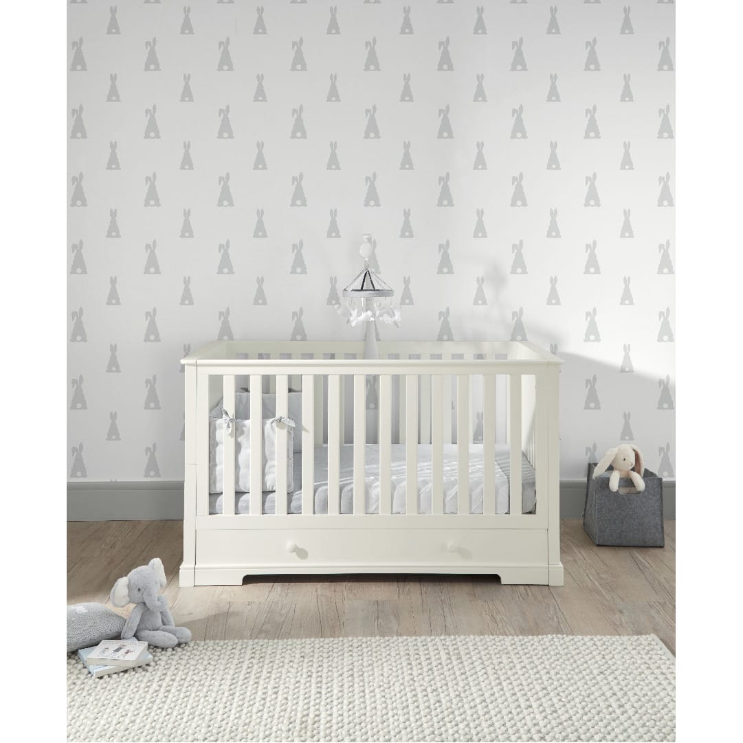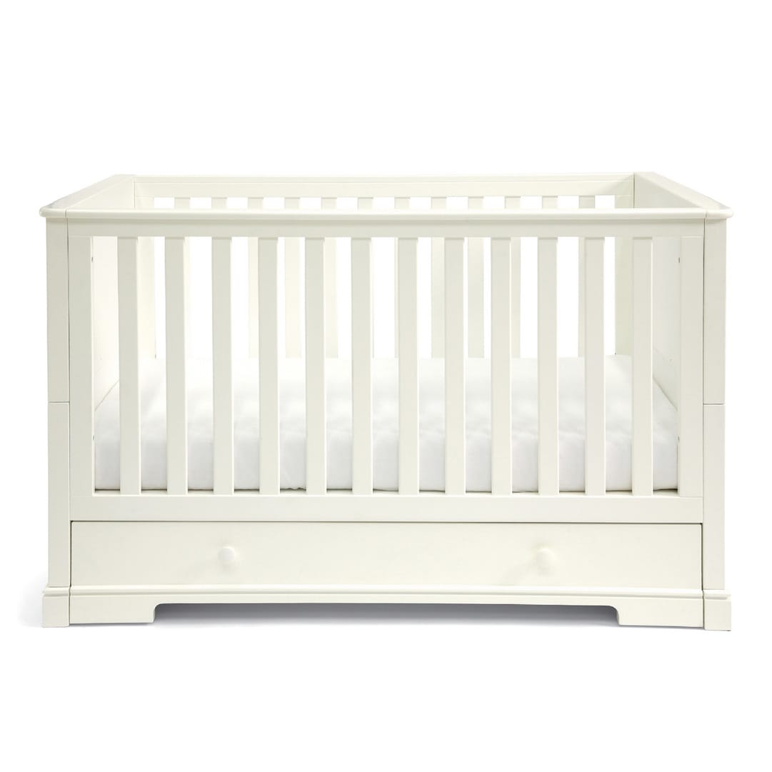 The white cot converts into a day and toddler bed to extend its use. Store bedding and other essentials in the under-bed, soft close drawer.