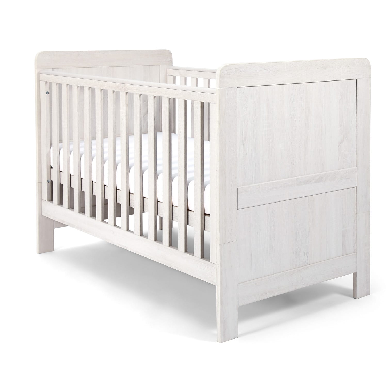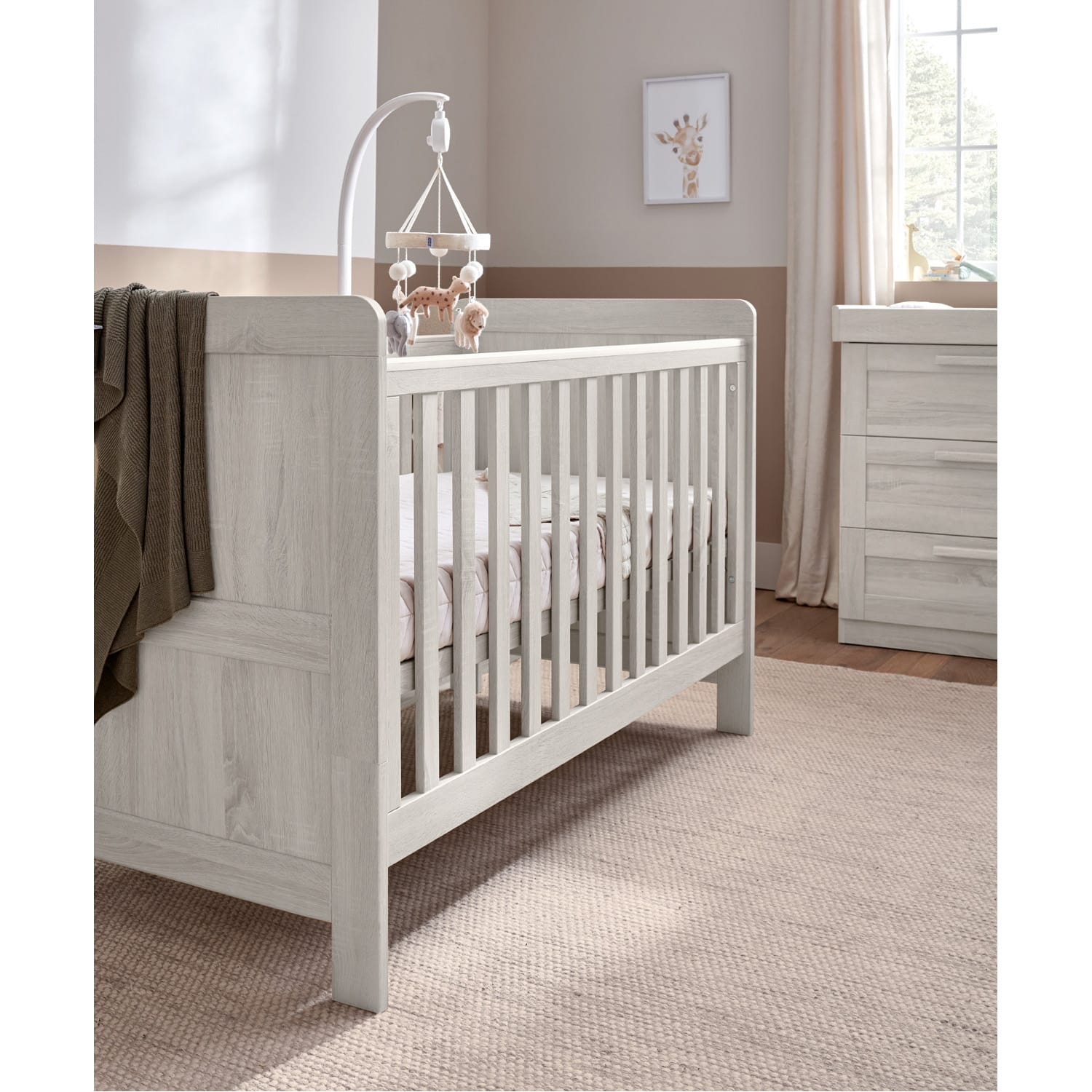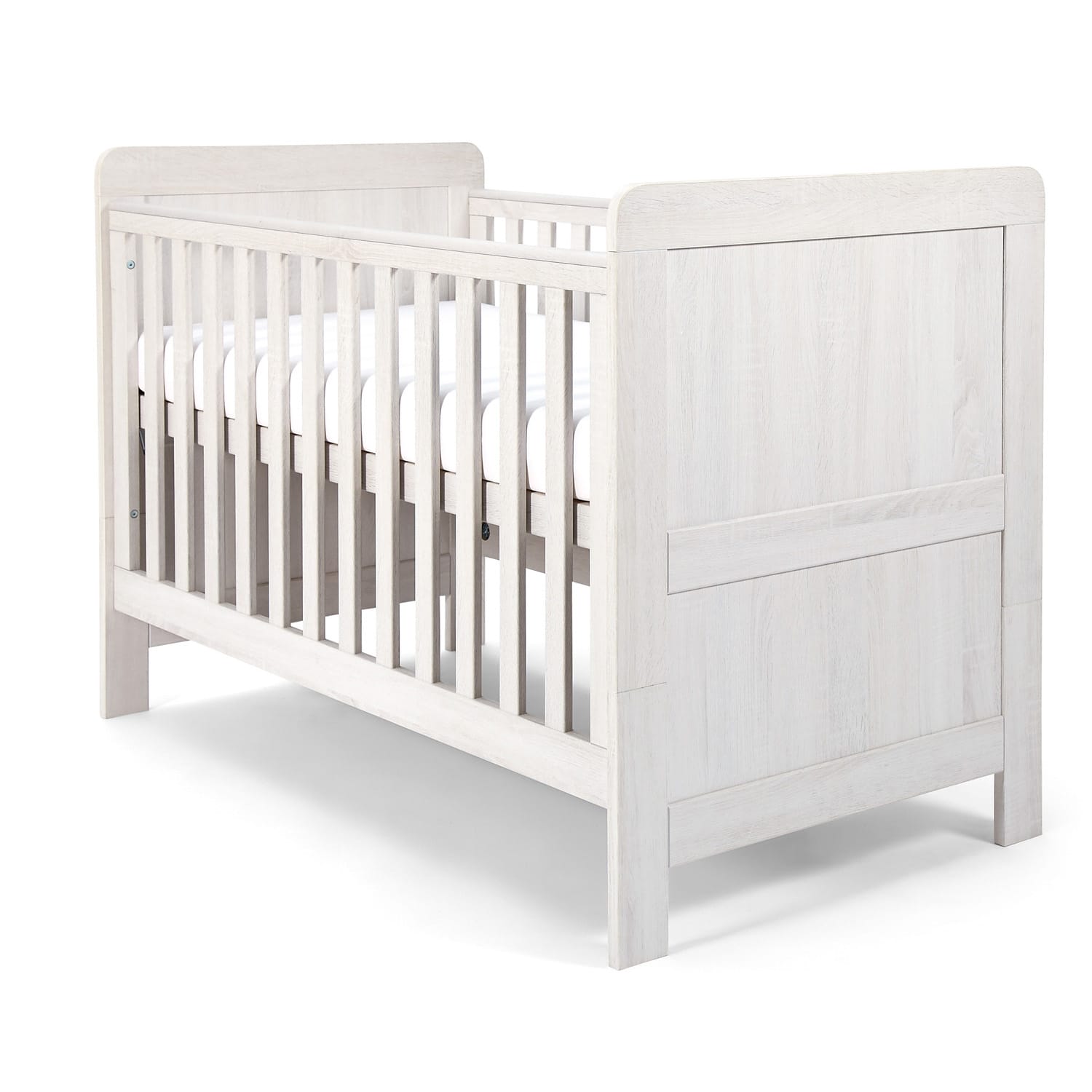 Fixed wooden panels keep this white cot bed secure. Remove the sides when your little one is ready to convert into a toddler bed.