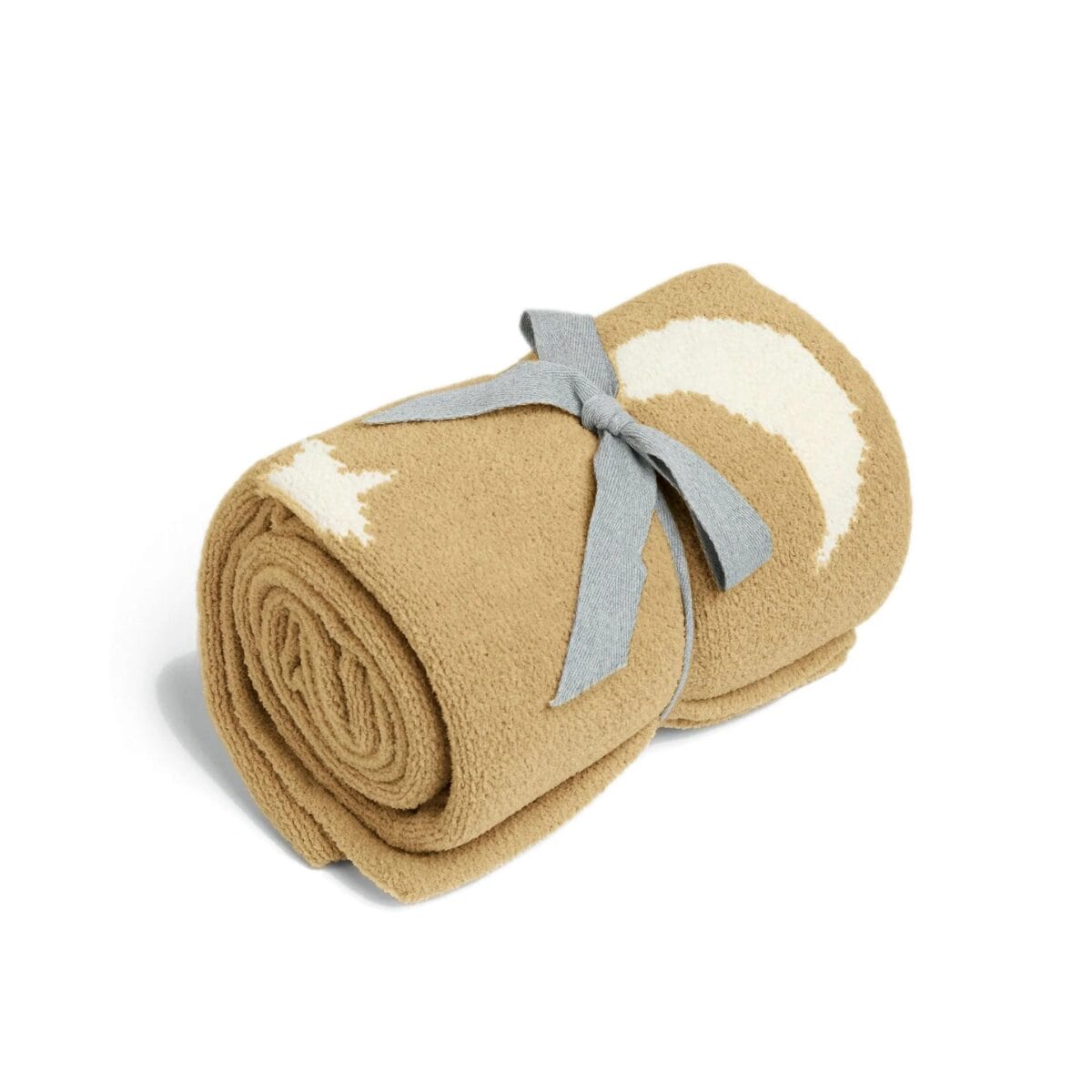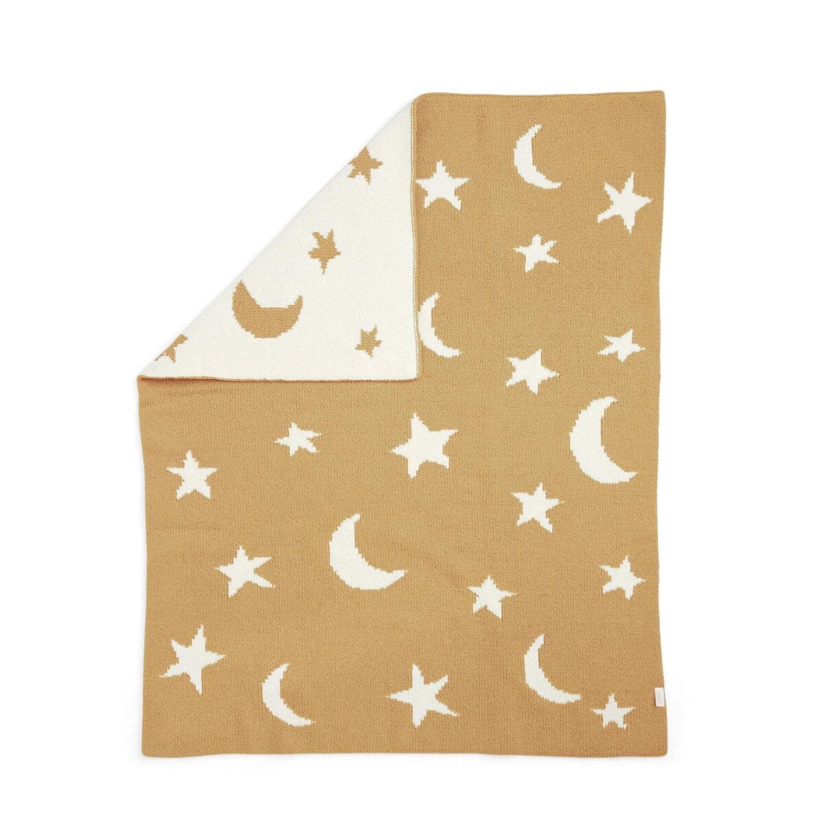 Super-soft mustard chenille blanket featuring a contrasting celestial-inspired moon and star print. Same design with opposite colours on the reverse. Machine washable.