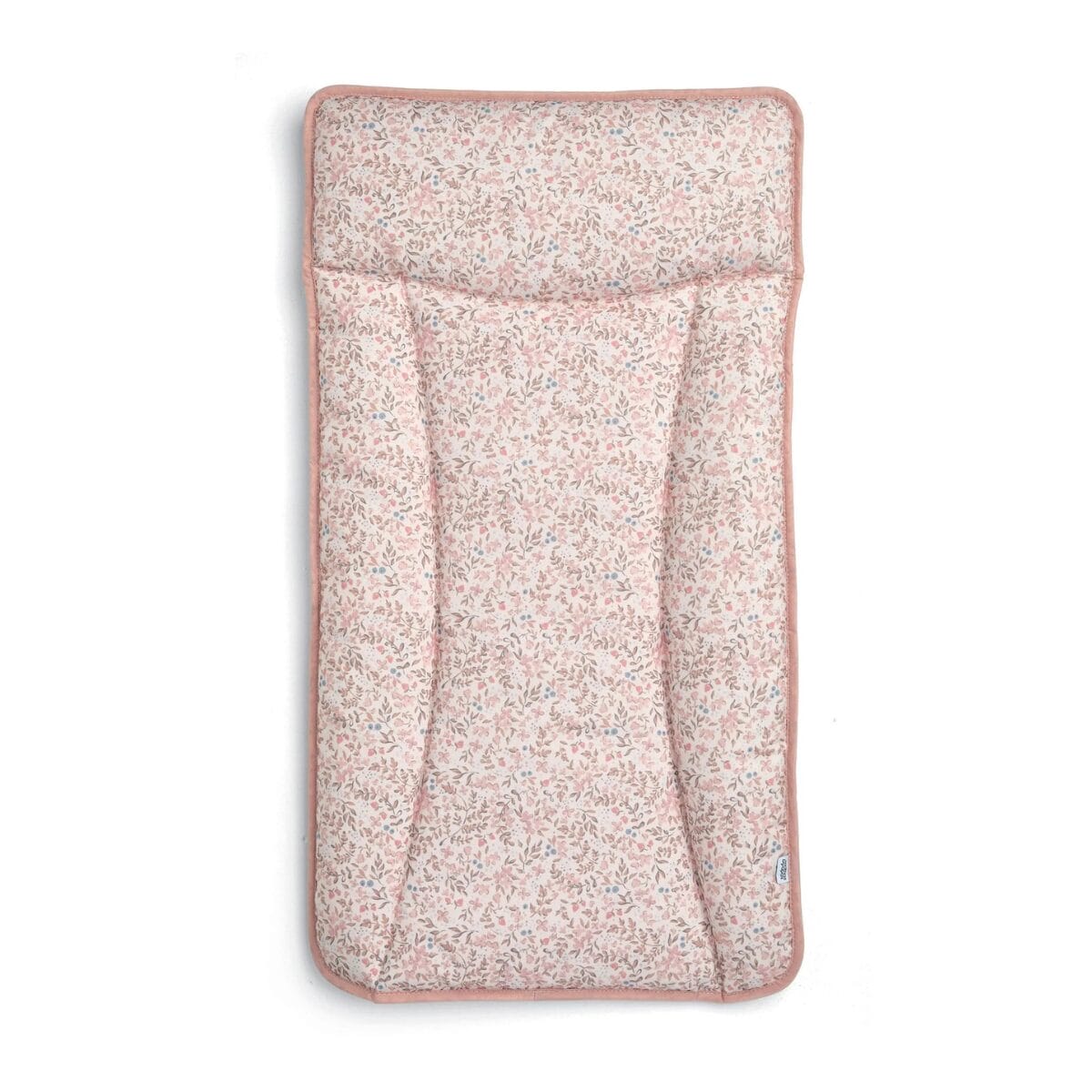 Shaped and padded for their comfort as you change their nappy or dress them. Made from 100% recycled polyester and recycled nylon binding. Featuring a ditsy floral and strawberry print on a soft pink background.