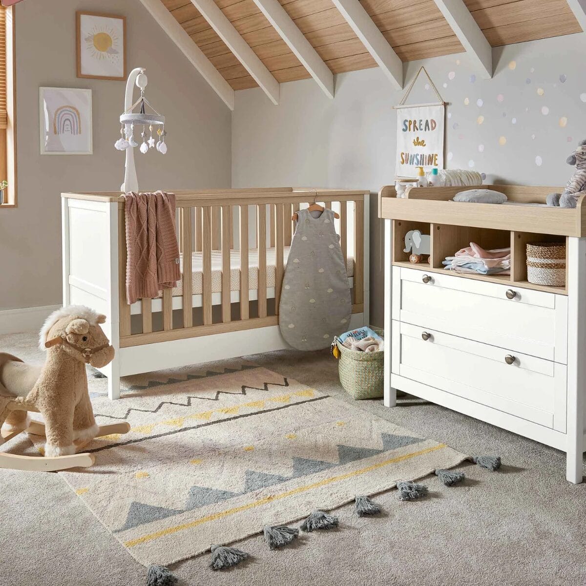 This 2 piece Harwell cot bed and dresser changer set has your nursery essentials covered. The cot bed has 3 adjustable base heights and easily converts into a toddler bed, whilst the dresser changer has a removable top – so you won’t need to upgrade your furniture when your little one has a growth spurt. And thanks to the drawers and storage on the dresser, there’ll be plenty of room for all of those clean outfits.