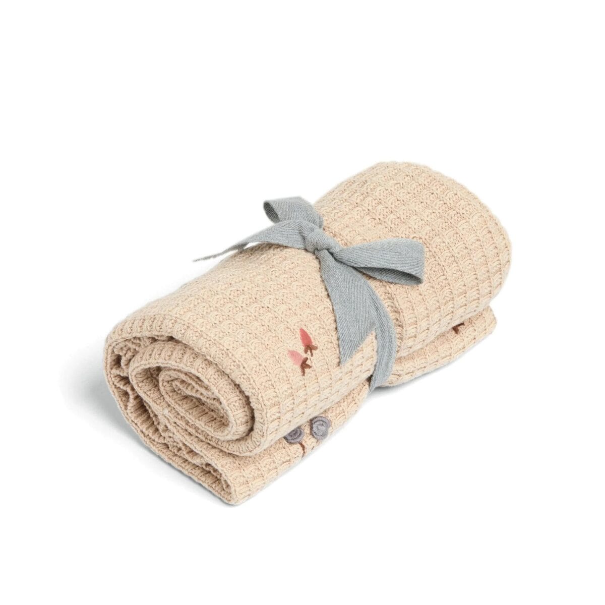 Lightweight, waffle-effect knitted cotton blanket. Featuring beautiful berry and flower bud embroidery detail and finished with a pretty frilled edge. Machine washable.