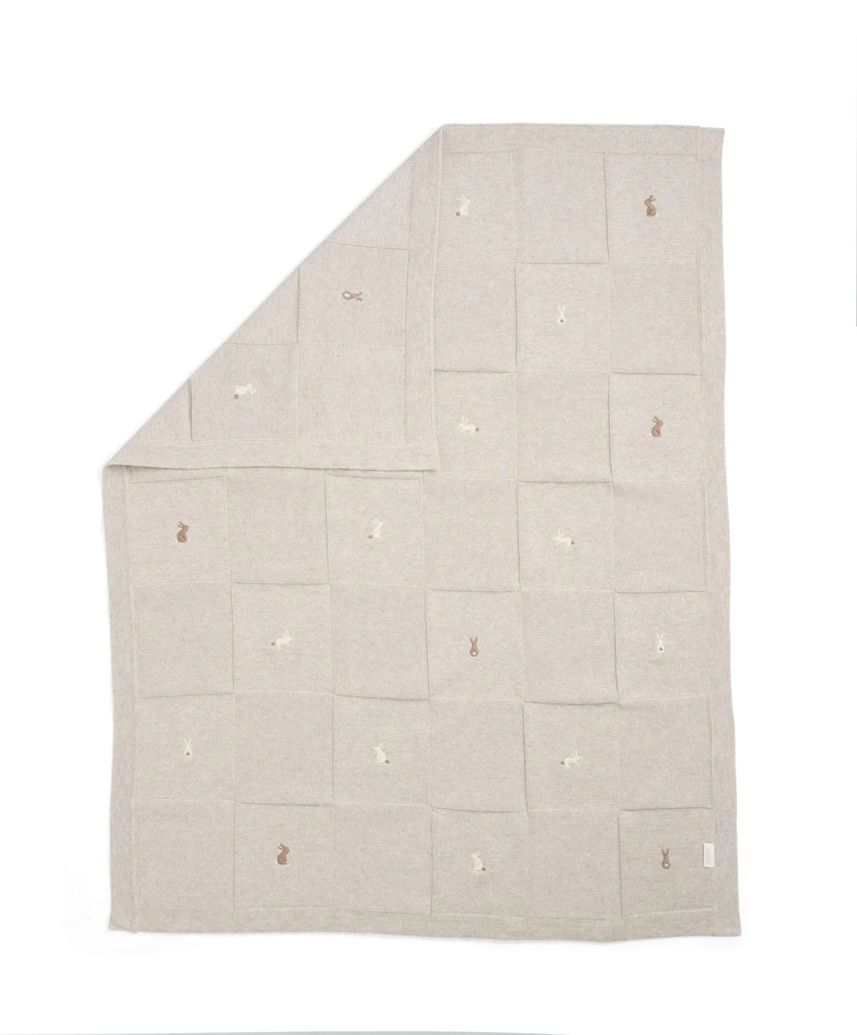 An adorable soft cotton blanket in gentle grey and neutral tones. Featuring a patchwork knitted design and delicate embroidered bunny detailing, it’s as cosy as it is cute. Machine washable.