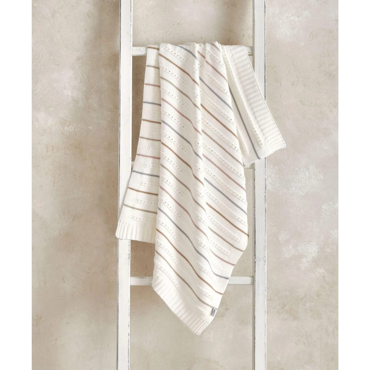 Beautiful neutral-striped blanket featuring a fine knitted pattern and ribbed edging, made from 100% soft cotton. Machine washable.