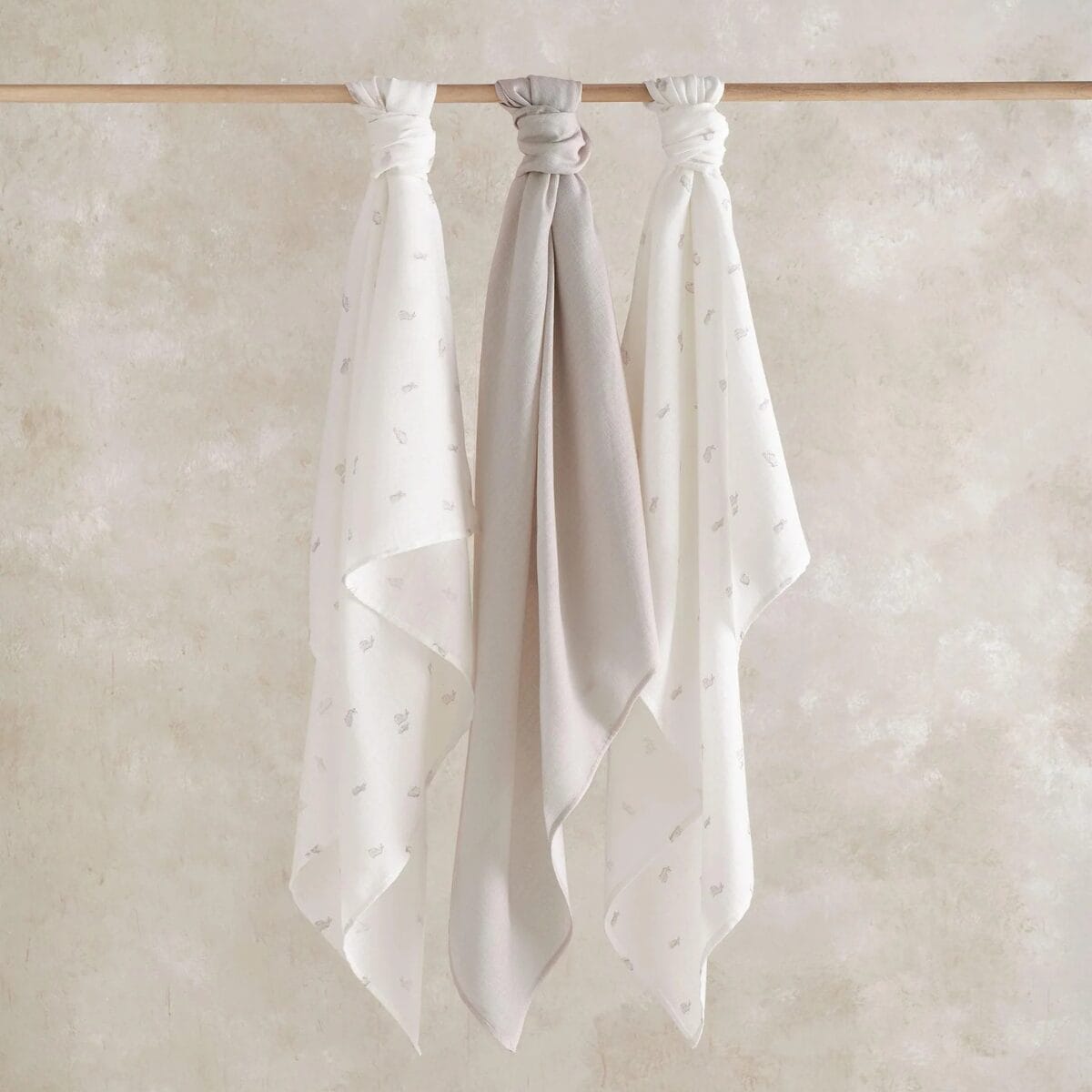 Handy 3-pack of versatile muslin squares in a large 90cm x 90cm size. Featuring adorable, illustrated detail and neutral colours to coordinate with this collection. Includes 2 bunny print muslins and 1 pure muslin in a soft neutral shade. Crafted from super-soft cotton.