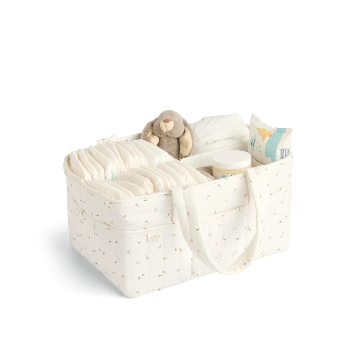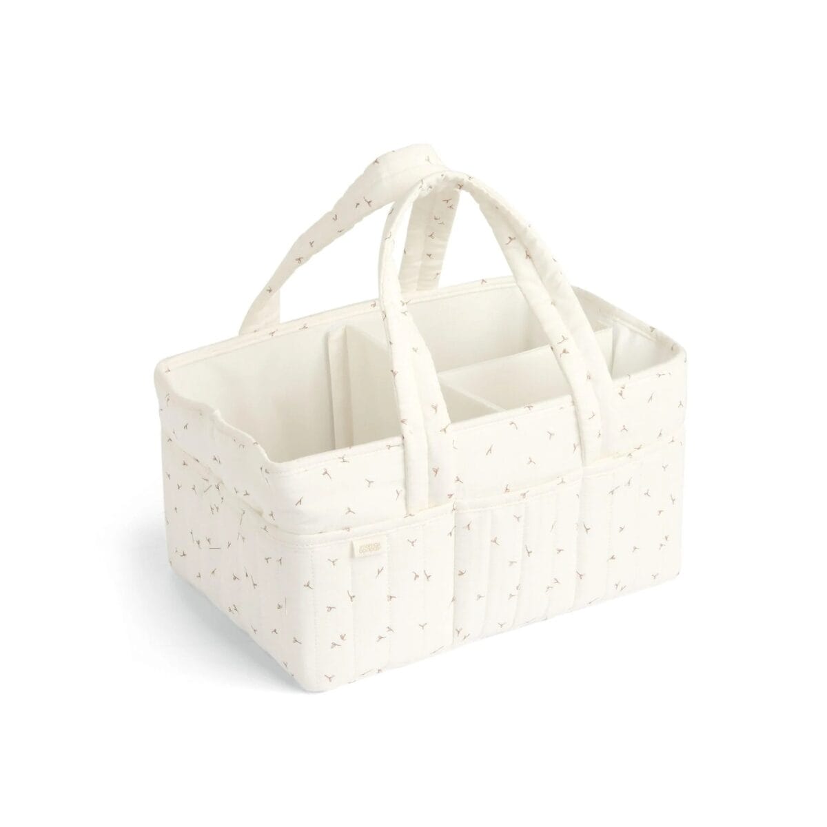 A stylish place to store all your changing essentials. Plenty of space to store, thanks to three inner compartments with removeable inserts and outer pockets for smaller items. Large handles allow you to move it easily around the house and folds down flat when not in use. Made from a natural soft organic cotton waffle fabric in a beautiful Seedling print that coordinates with Mamas & Papas Welcome to the World Seedling collection.