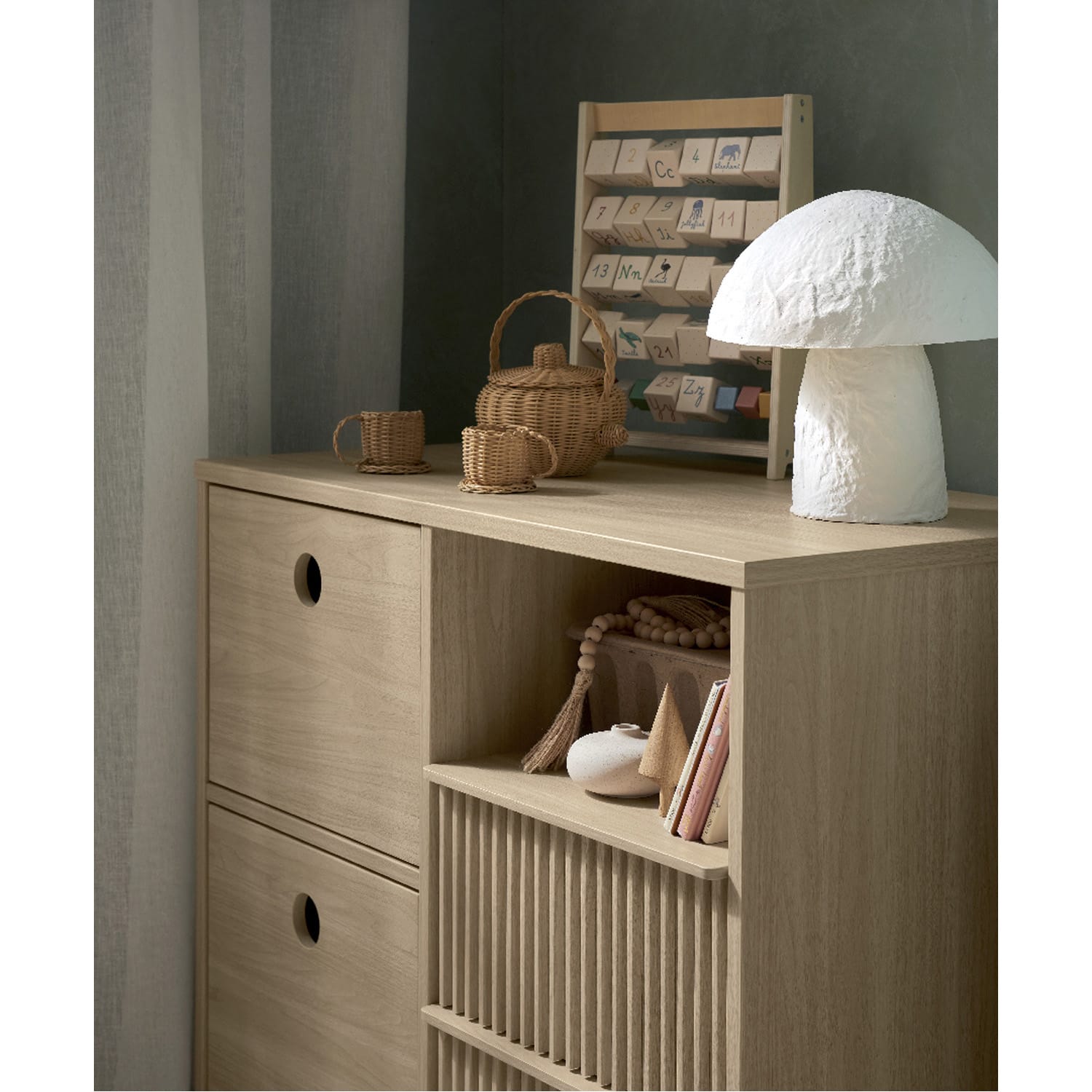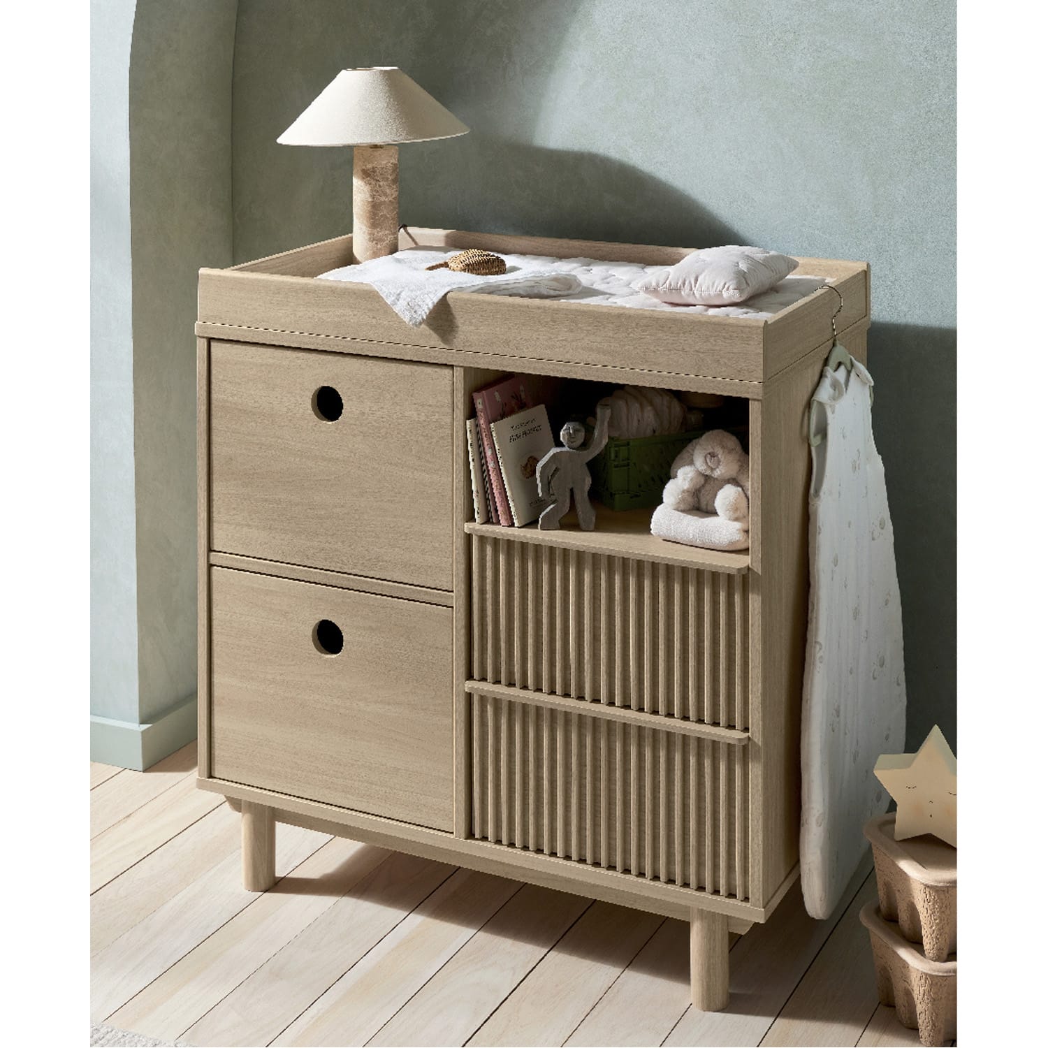 Designed to grow alongside your little one, our Oska dresser changer pairs thoughtful design with lasting function. A removable changing top transforms it from a practical baby-changing space into a stylish dresser you’ll use for years. With soft-close drawers in various sizes and open shelving, it offers flexible storage for everything from daily essentials to accessories and clothing. Drawing on Scandinavian and Japanese design influences, its warm oak tones, slatted detailing, and smooth curves bring a serene, modern touch to your nursery.
