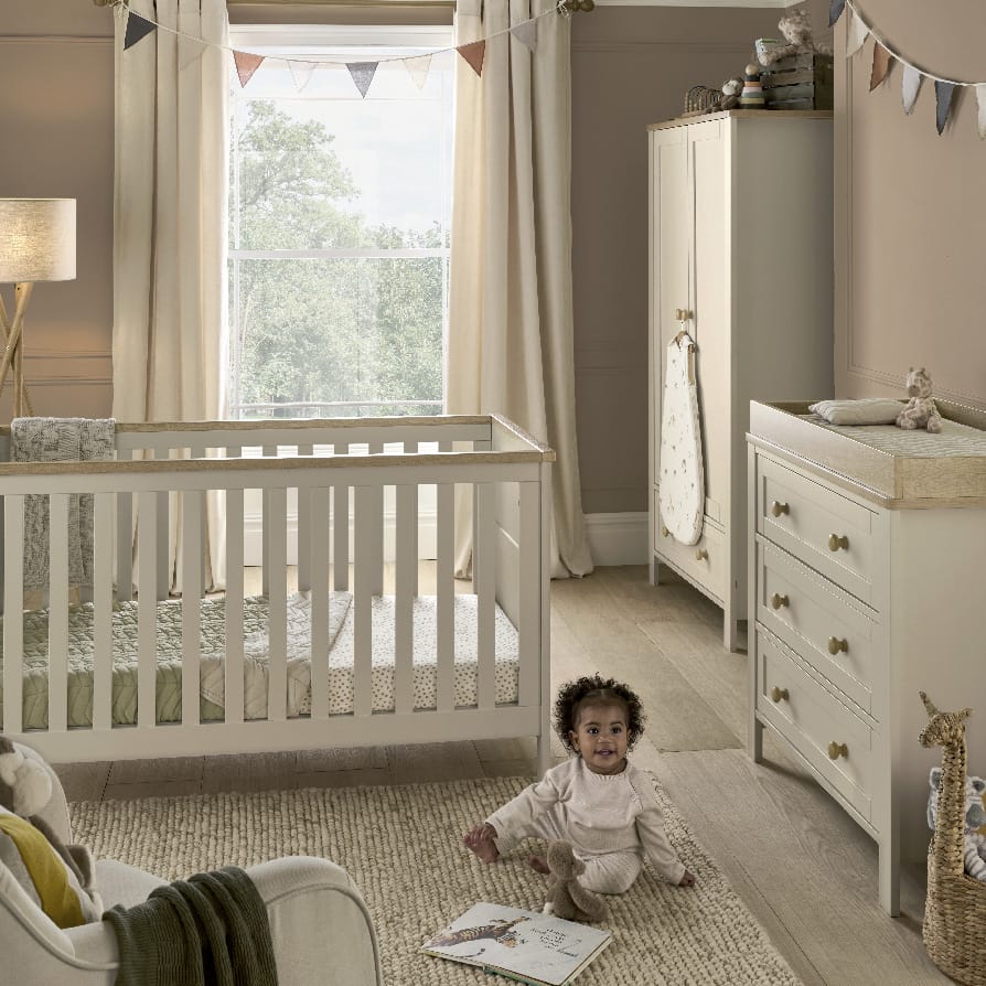 Thanks to a baby cot bed that converts into a toddler bed and a removable changing top for your nursery dresser, our Wedmore 3-piece nursery furniture set will see baby from newborn into toddler years and beyond. And when it’s time for a nap, the 3 adjustable cot base heights ensure baby is safe as they grow bigger and become more mobile.