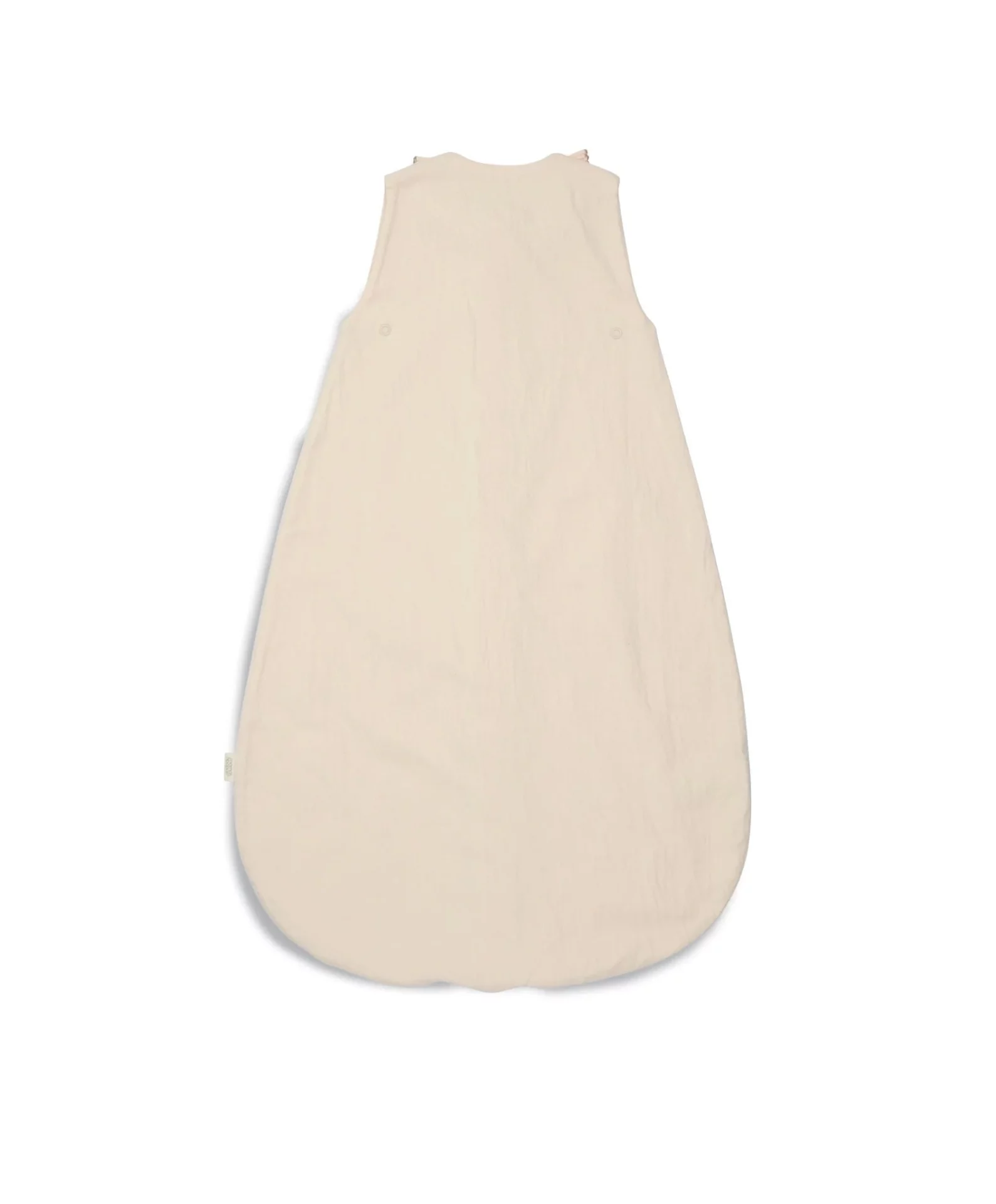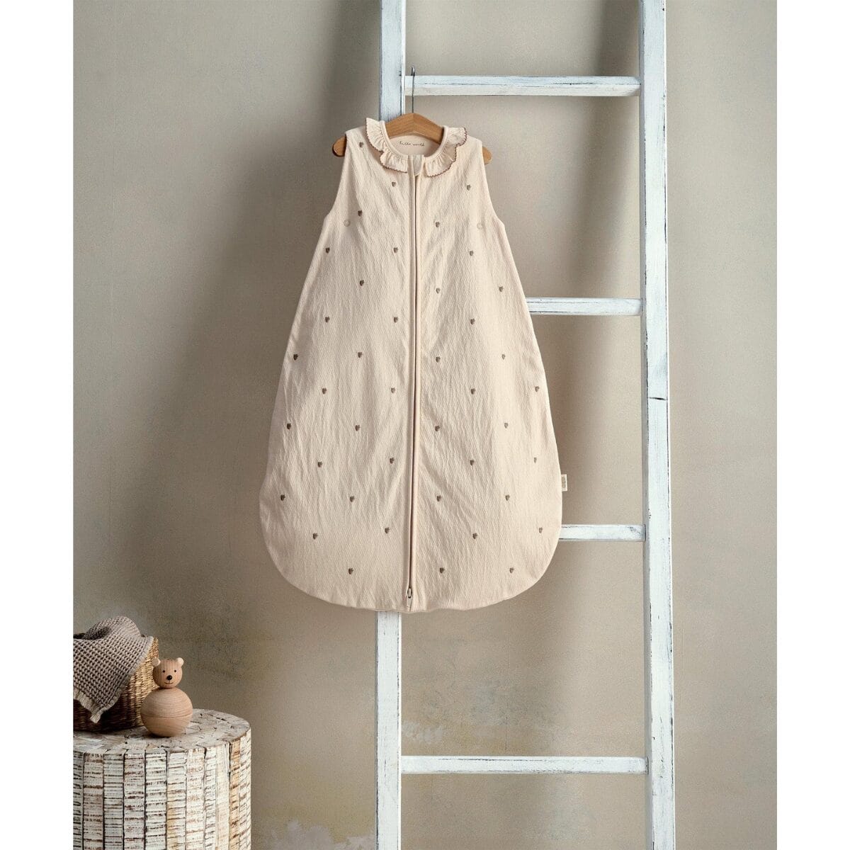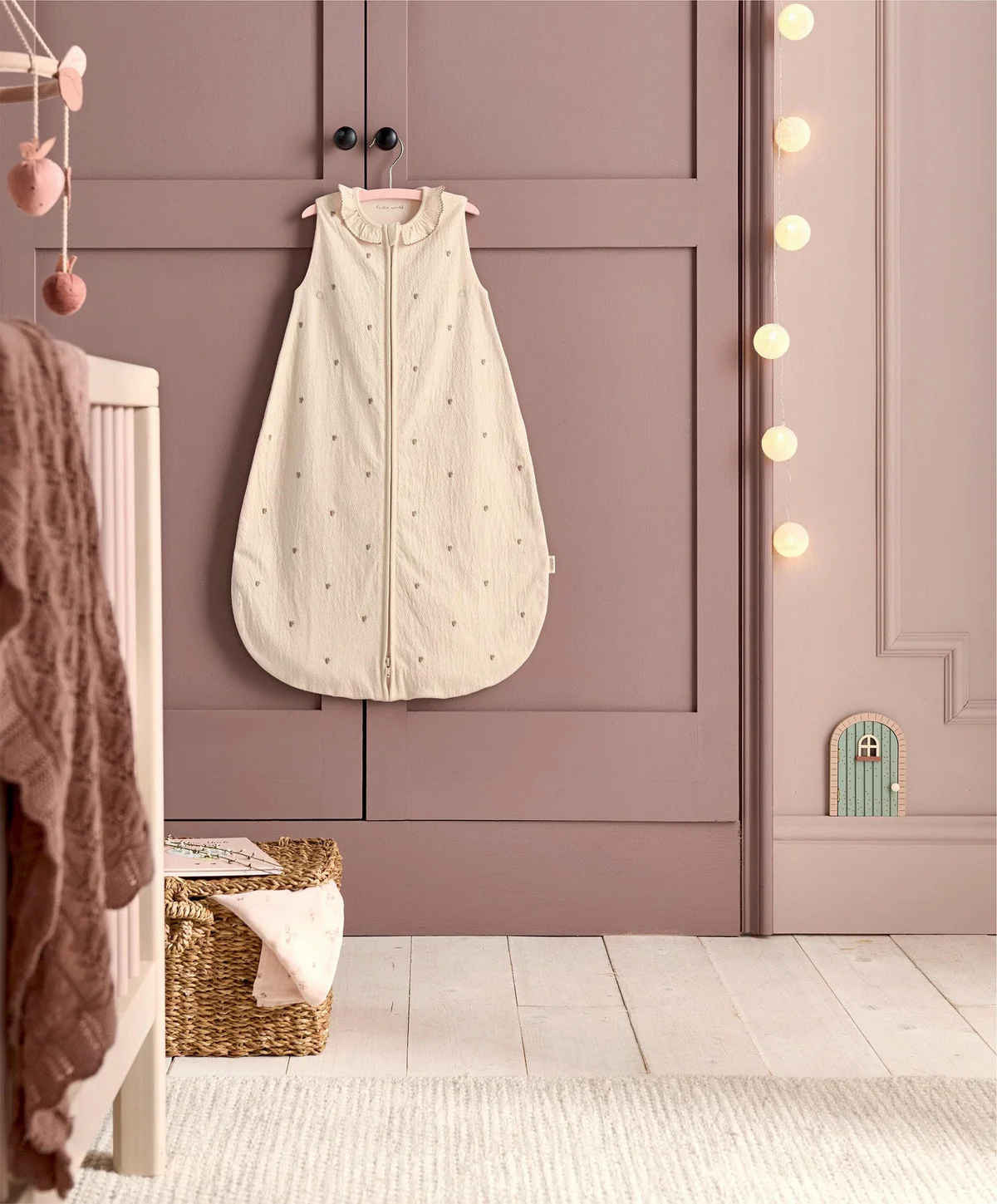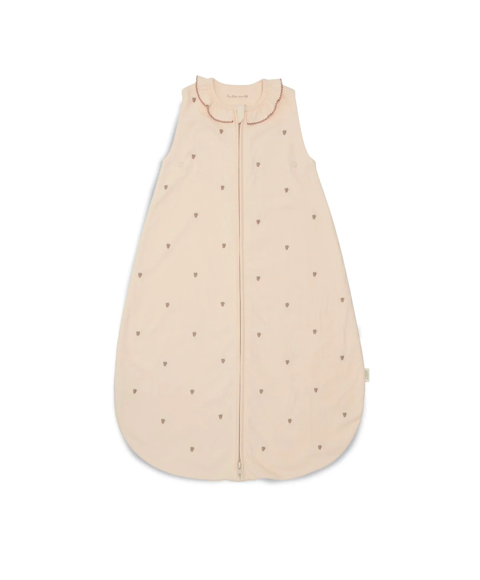 Pale pink textured dreampod, for ages 0-6 months. With delicate strawberry embroidery detail. Frilled collar detail with contrast picot trim. In lighter 1.0 Tog jersey fabric, perfect for the summer months.