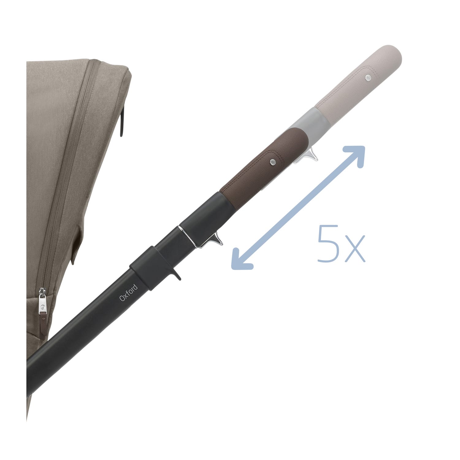 The ergonomic push bar with vegan leatherette is designed to be easily gripped and has 5 positions to match every parent’s height.
