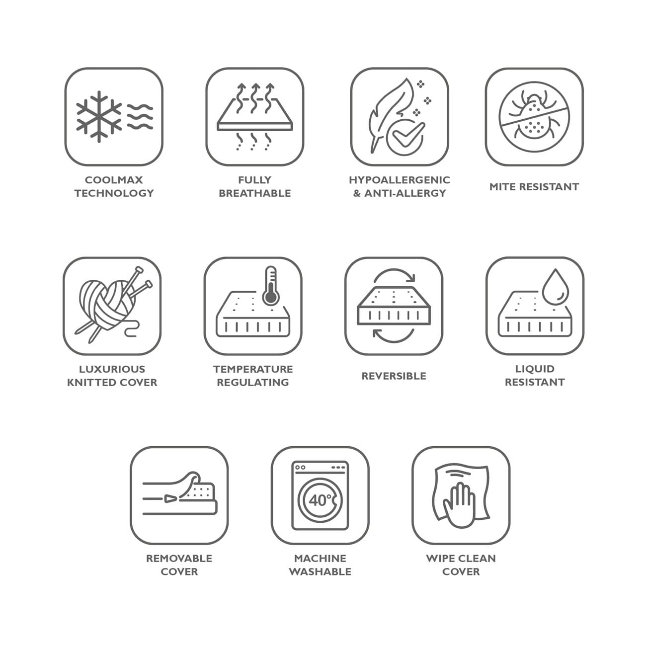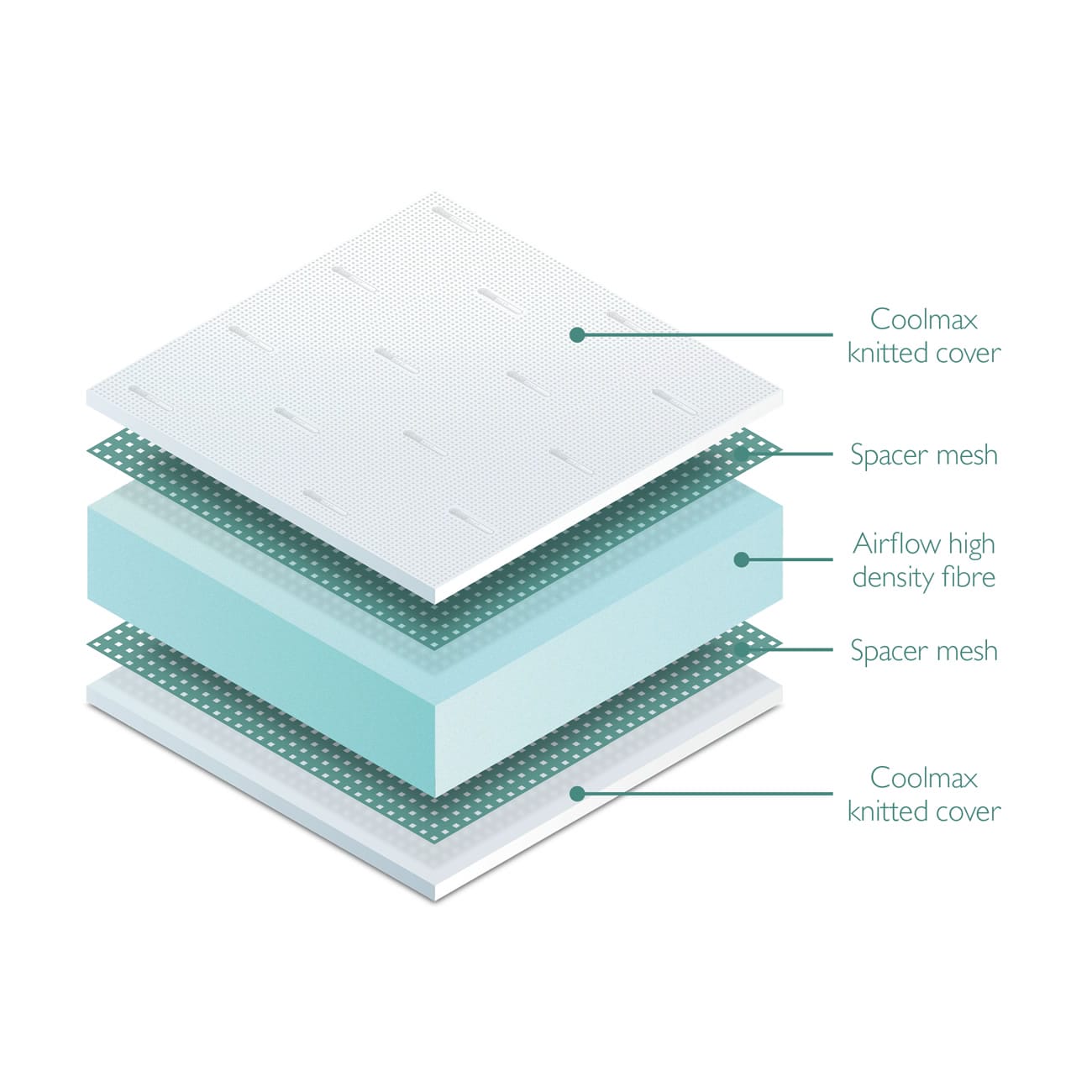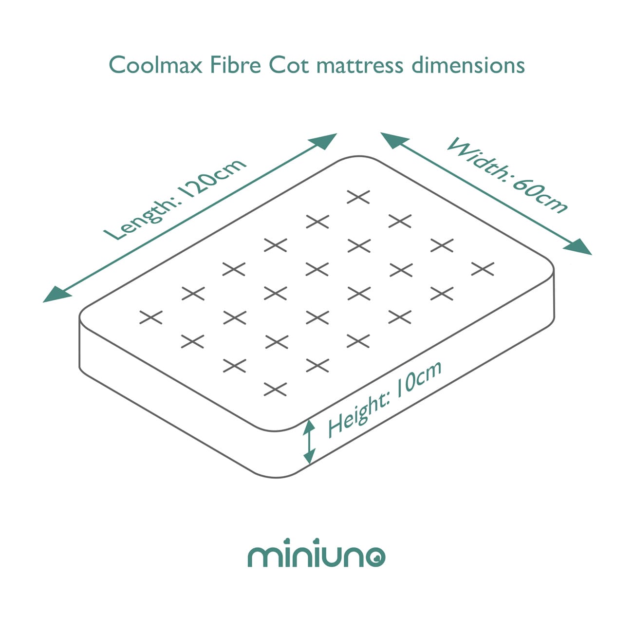 The miniuno Coolmax Fibre Cot mattress (size: 120 x 60cm) has a luxurious knitted cover with spacer mesh and Coolmax technology to absorb, store and release heat to keep your baby at the optimum temperature. The premium quality airflow fibre core supports your baby’s back, neck, and head. The hypoallergenic, anti-allergy and water repellent cover keeps the interior fresh and clean. The mattress is fully breathable, mite resistant and air-permeable, plus the cover can be removed and machine washed up to 40 degrees.
