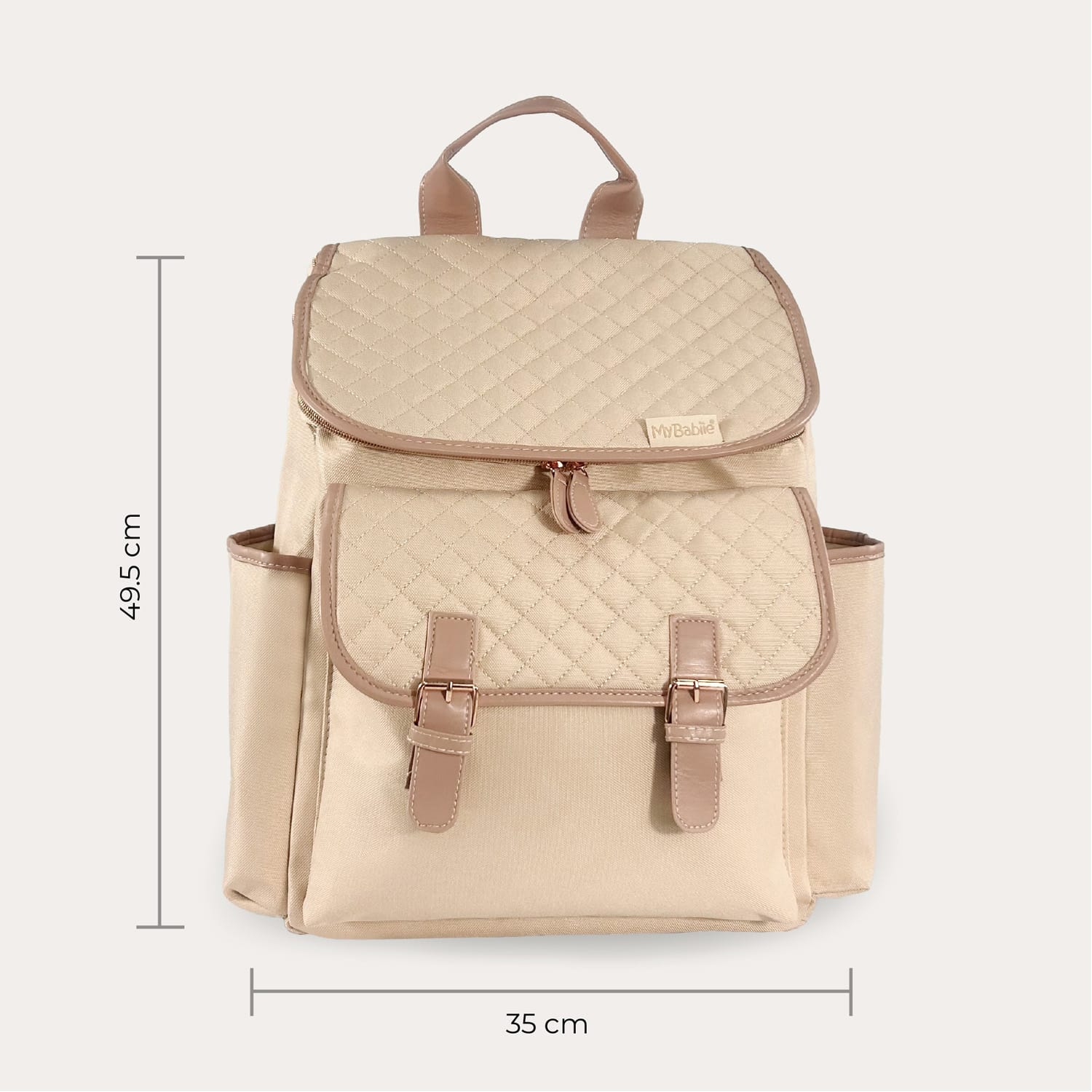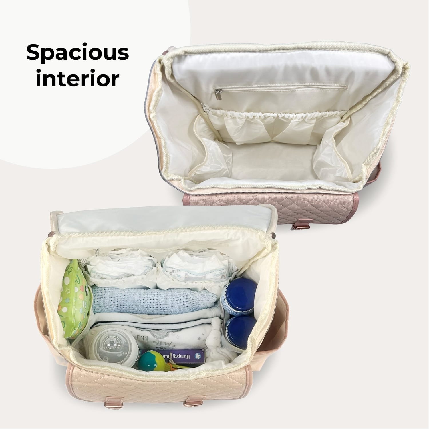 The stylish and practical blush quilted backpack changing bag with rose gold detailing provides you with plenty of space to store all your baby’s necessities when you’re out and about. This backpack changing bag comes with a padded changing mat, insulated bottle holder, a large pocket at the front with 2 side pockets, perfect for all your bits and bobs. The adjustable and padded shoulder straps makes carrying this diaper bag easy and comfortable.