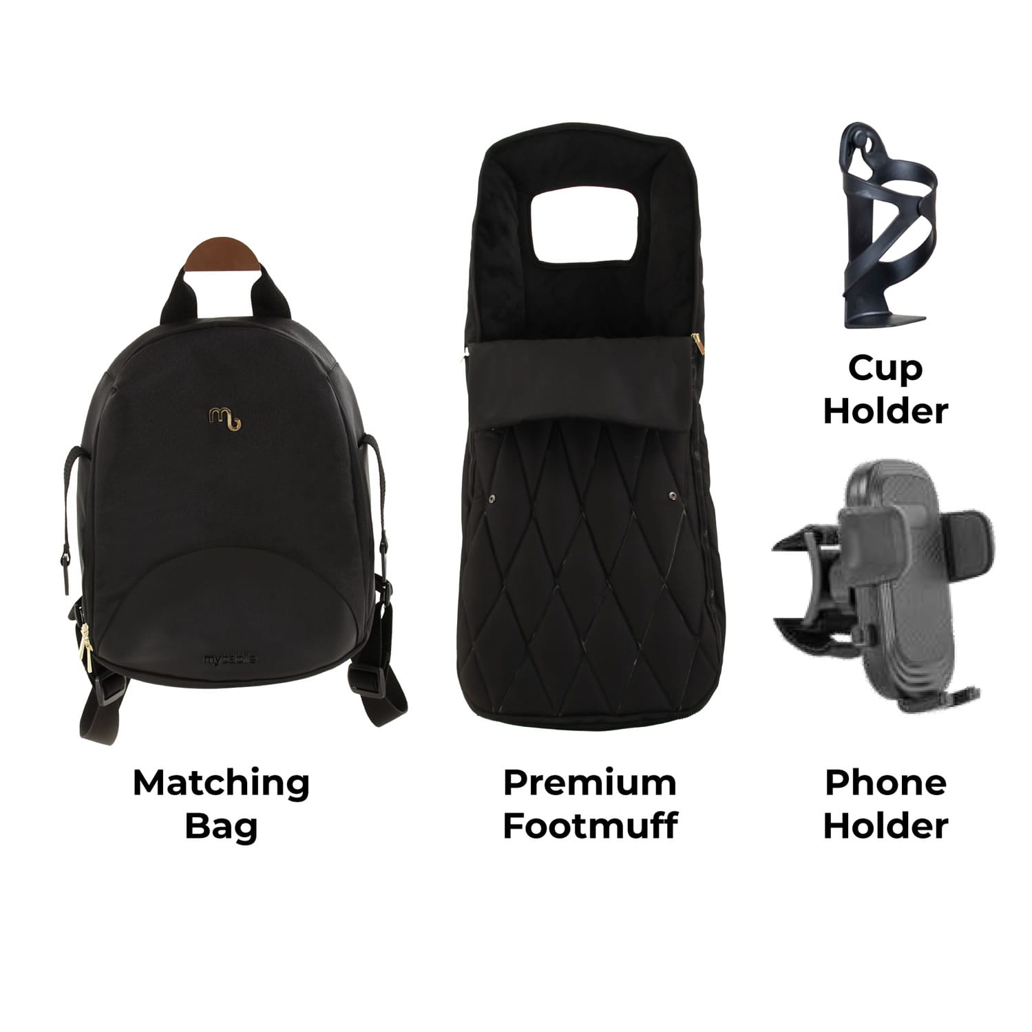 Premium foot-muff, matching backpack changing bag, phone holder, cup holder and waterproof rain-cover