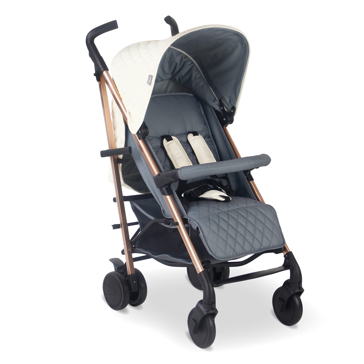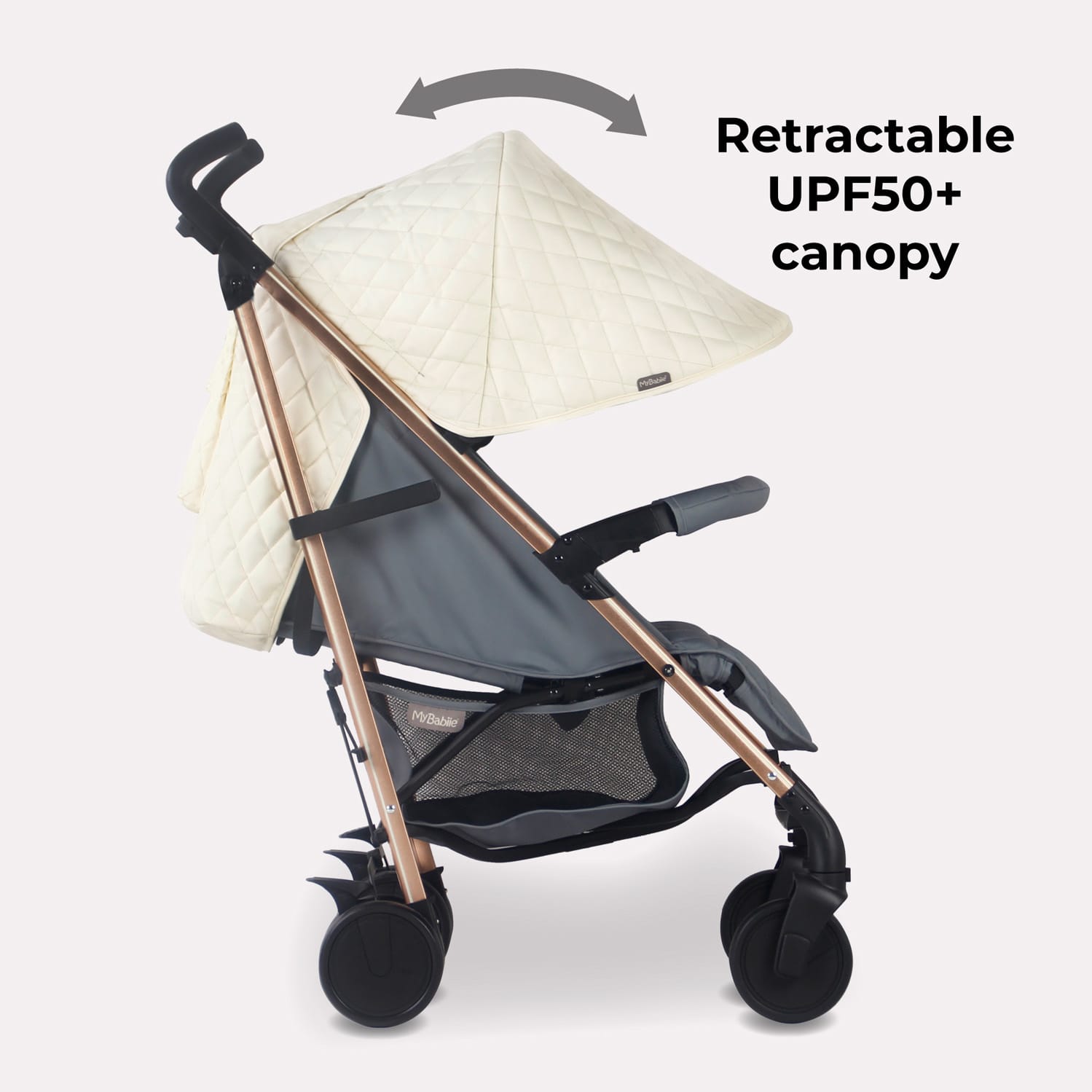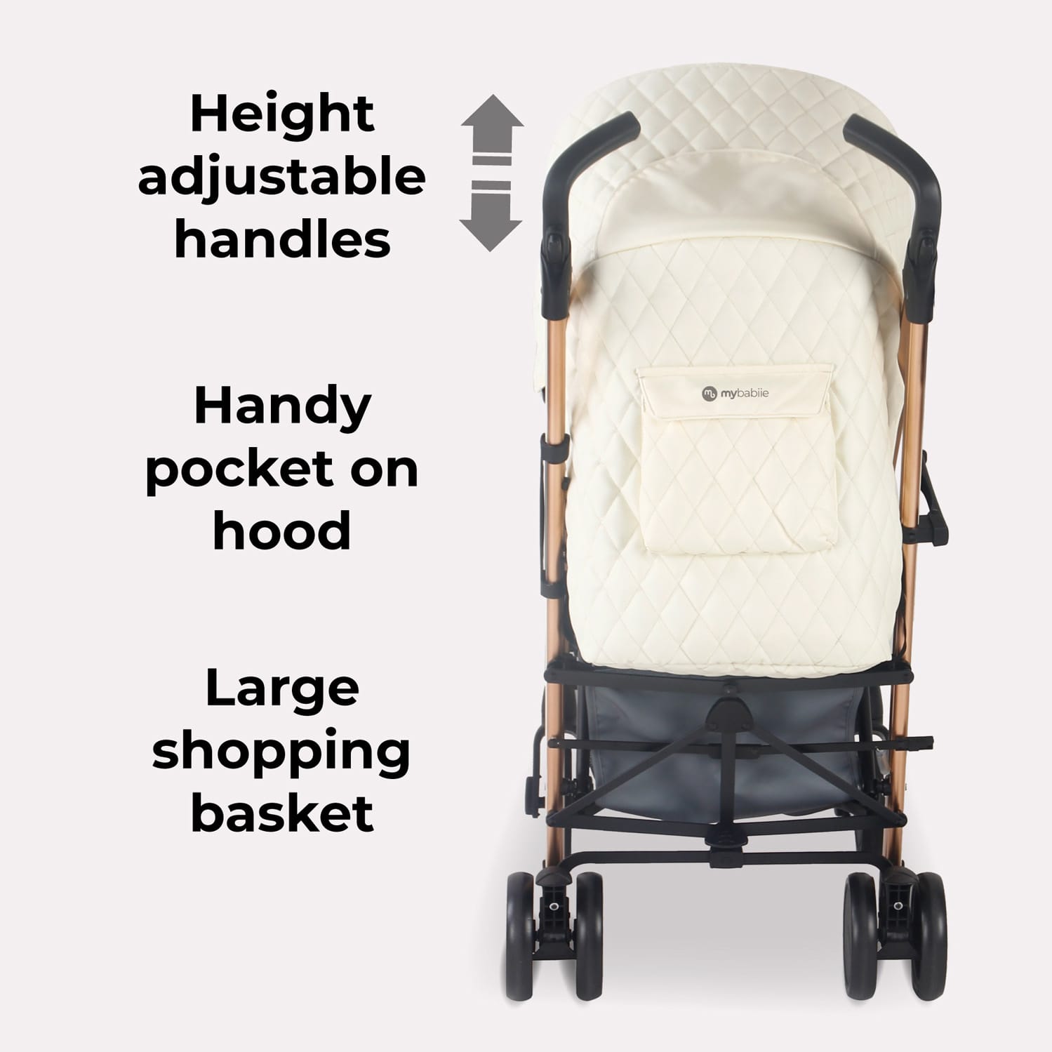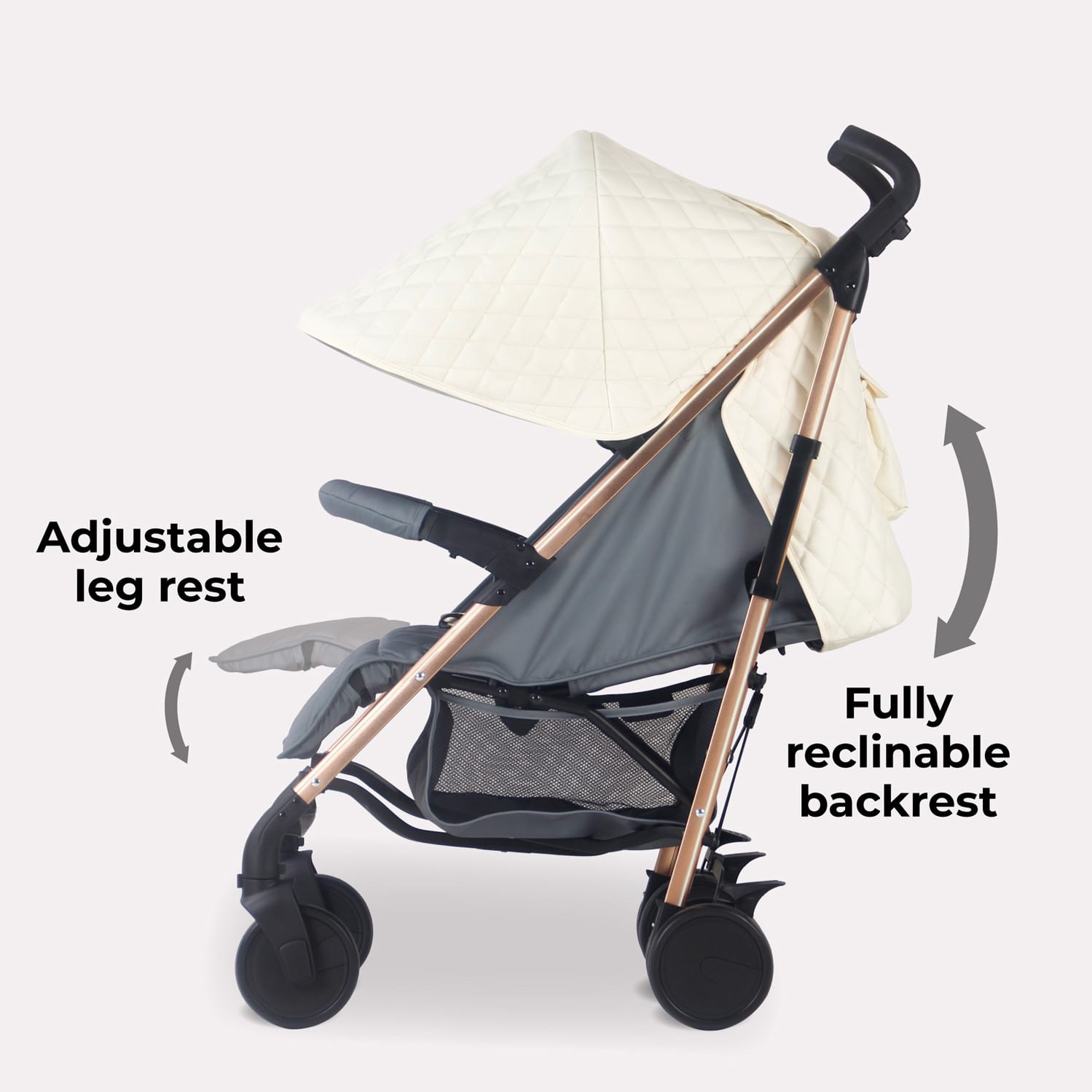 This stylish quilted champagne stroller combines the style and function you expect from a super talented mum. Tough enough to take everywhere with you and use everyday, the lightweight aluminium umbrella fold stroller is packed with features to make using it as comfortable for you and your little one as possible. Suitable from birth, the seat reclines right back and has an adjustable leg support so your little can sit, or lay back in total comfort, shade from the sun and elements by an extendable 3 position UPF canopy. Suspension all round and single front wheels means the ride is super smooth, and adjustable handles mean you can push in comfort too. The basket is large and there is a handy pocket at the back of the hood for your phone (or snacks!), and a viewing window so you can maintain a visual on your precious cargo. This lightweight stroller comes with a rain cover so that if you are strolling and it starts to rain, we have you covered!