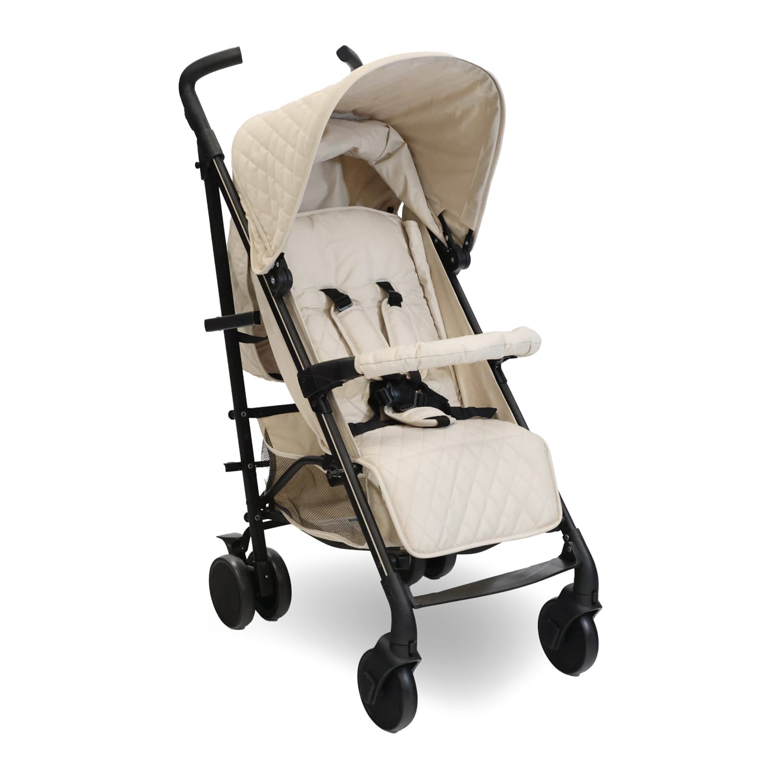 This stylish quilted sand stroller combines the style and function you expect from a super talented mum. Tough enough to take everywhere with you and use everyday, the lightweight aluminium umbrella fold stroller is packed with features to make using it as comfortable for you and your little one as possible. Suitable from birth, the seat reclines right back and has an adjustable leg support so your little can sit, or lay back in total comfort, shade from the sun and elements by an extendable 3 position UPF canopy. Suspension all round and single front wheels means the ride is super smooth, and adjustable handles mean you can push in comfort too. The basket is large and there is a handy pocket at the back of the hood for your phone (or snacks!), and a viewing window so you can maintain a visual on your precious cargo. This lightweight stroller comes with a rain cover so that if you are strolling and it starts to rain, we have you covered!