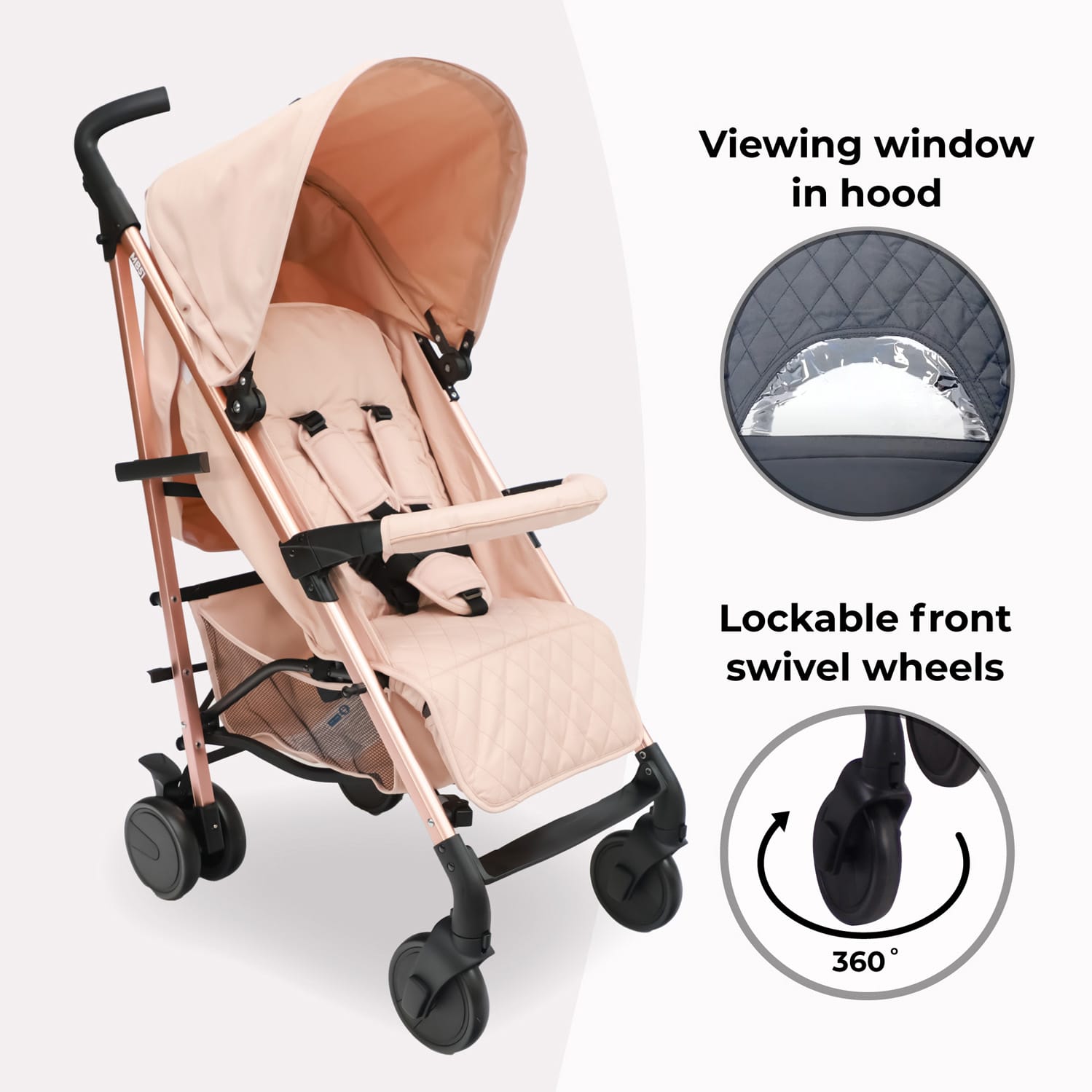 This stylish blush stroller with a rose gold frame design combines the style and function you expect from a super talented mum. Tough enough to take everywhere with you and use everyday, the lightweight aluminium umbrella fold stroller is packed with features to make using it as comfortable for you and your little as possible. Suitable from birth, the seat reclines right back and has an adjustable leg support so your little can sit, or lay back in total comfort, shaded from the sun and elements by an extendable 3 position UPF canopy. Suspension all round and single front wheels means the ride is super smooth, and adjustable handles mean you can push in comfort too. The basket is large and there is a handy pocket at the back of the hood for your phone (or snacks!), and a viewing window so you can maintain a visual on your precious cargo. This lightweight stroller comes with a rain cover so that if you are strolling and it starts to rain, we have you covered!