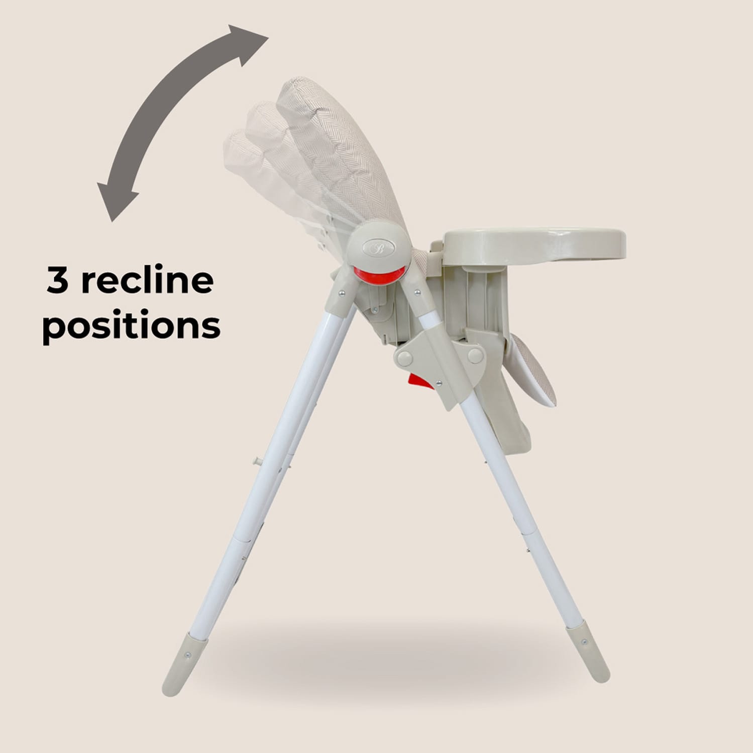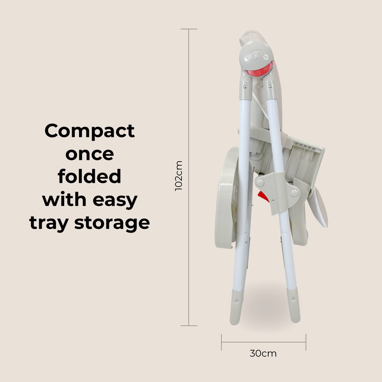 The MBHC8 premium highchair boasts a stylish oatmeal herringbone design for an on-trend, refined look. The Highchair has a minimalist white frame and is cleverly styled for little ones that love to dream big. This highchair is sleek & stowable. Its two-part removable tray conveniently detaches when done and clips on the back of the highchair for a slim silhouette. With an easy-fold design, it stands on its own when folded and can be stored out of the way when not in use. But with an eye-catching and stylish design like this, you can be just as happy leaving it up in the kitchen all of the time!