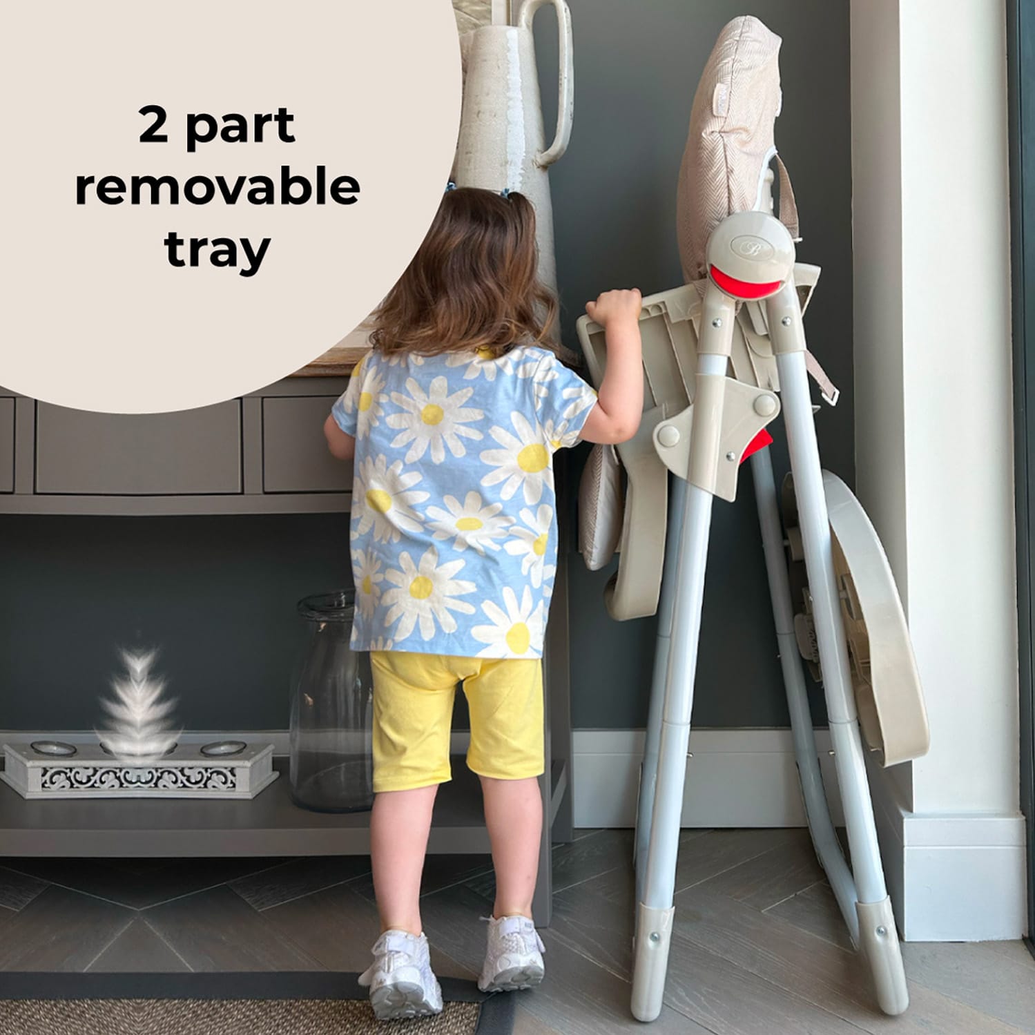 The highchair has 6 height settings so you can feed your little while standing or sitting and resting your legs, and you can adjust it to sit them up at the table or counter-height, eating right along with the family. The 3 recline modes and extra padded comfy seat mean nap time doesn’t need to be far from finishing mealtime, but obviously we would always recommend using the 5-point safety harness for that! At dinner time, food is gonna go everywhere! So we made sure that the beautifully patterned seat pad removes easily for quick cleaning, and so does the removable and dishwasher-safe tray. So mealtimes are sure to be tidy, tasty and on-trend.