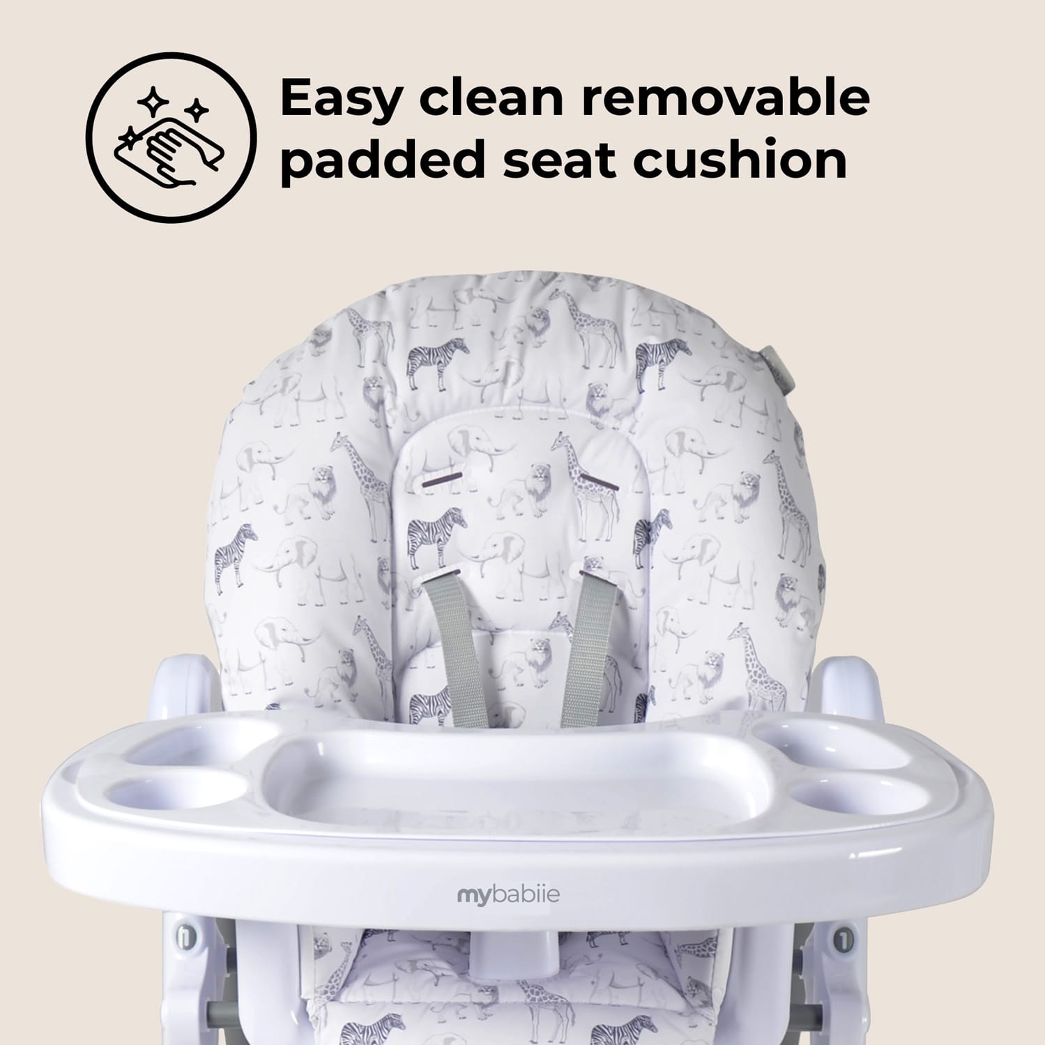 The MBHC8 premium highchair boasts a stylish safari print design for an on-trend, refined look. The highchair has a stylish grey frame and is cleverly styled for little ones that love to dream big. This highchair is sleek & stowable. Its two-part removable tray conveniently detaches when done and clips on the back of the highchair for a slim silhouette. With an easy-fold design, it stands on its own when folded and can be stored out of the way when not in use. But with an eye-catching and stylish design like this, you can be just as happy leaving it up in the kitchen all of the time!