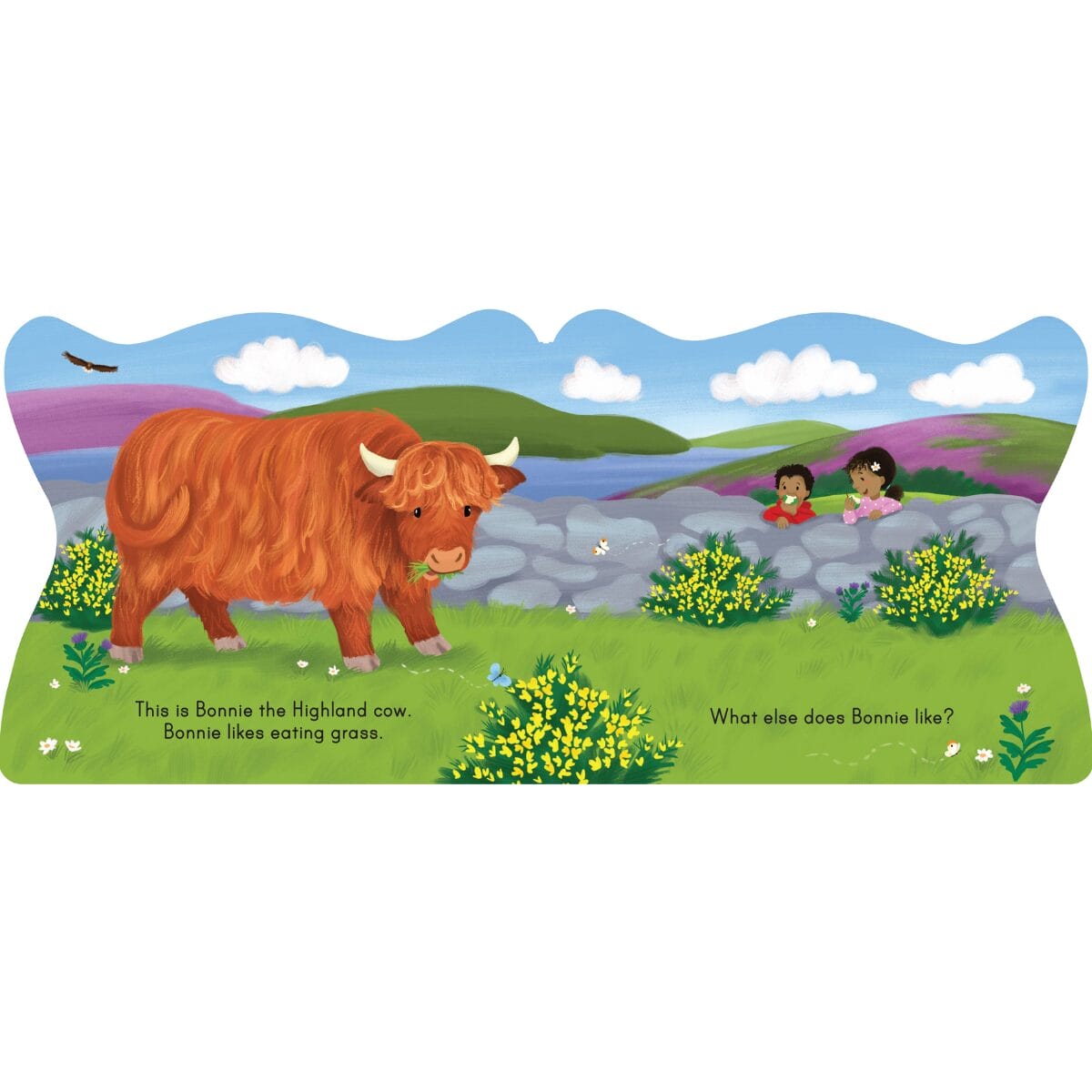 Meet Bonnie the Highland cow in this novelty shaped board book! Bonnie likes eating tasty grass, but she does not like pesky flies. Bonnie likes her warm hairy coat, but she does not like impatient cars. And Bonnie loves her new wee calf! Wee ones will enjoy spending time with a happy Highland cow and her friends in this colourful and sturdy board book, which is full of illustrations and lots of fun details to spot.