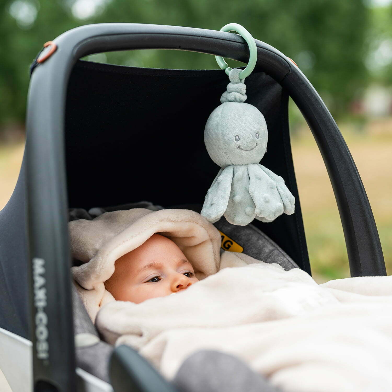 - Hang on the cot/car seat via the attachment ring