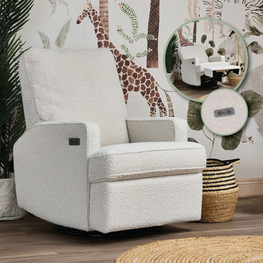 The nearly silent motor allows you to recline without disturbing your little one as they sleep in your arms, and a built-in USB & USBc port ensures your devices are always charged and within arm’s reach.