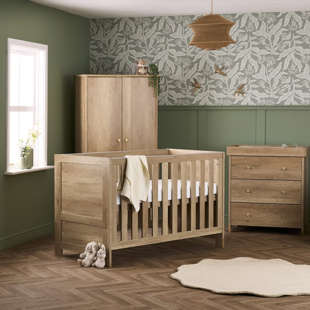 The Obaby Nika range offers a contemporary design, due to its clean lines and textured oak effect finish, that will fit perfectly in today’s modern nursery. This 3 piece room set consists of Nika cot bed, changing unit and double wardrobe.
