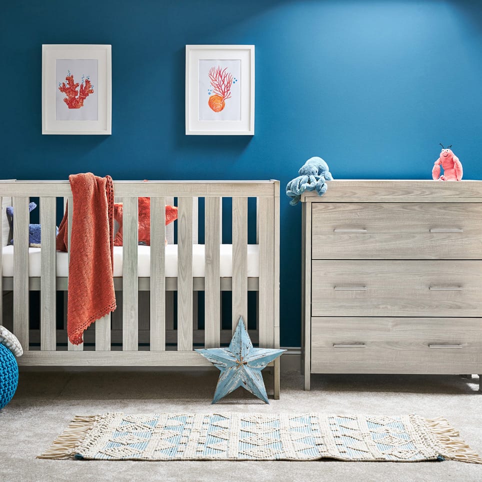 The Obaby Nika range offers a contemporary design, due to its clean lines and textured oak effect finish, that will fit perfectly in today’s modern nursery. This 2 piece room set consists of Nika Mini cot bed and changing unit.