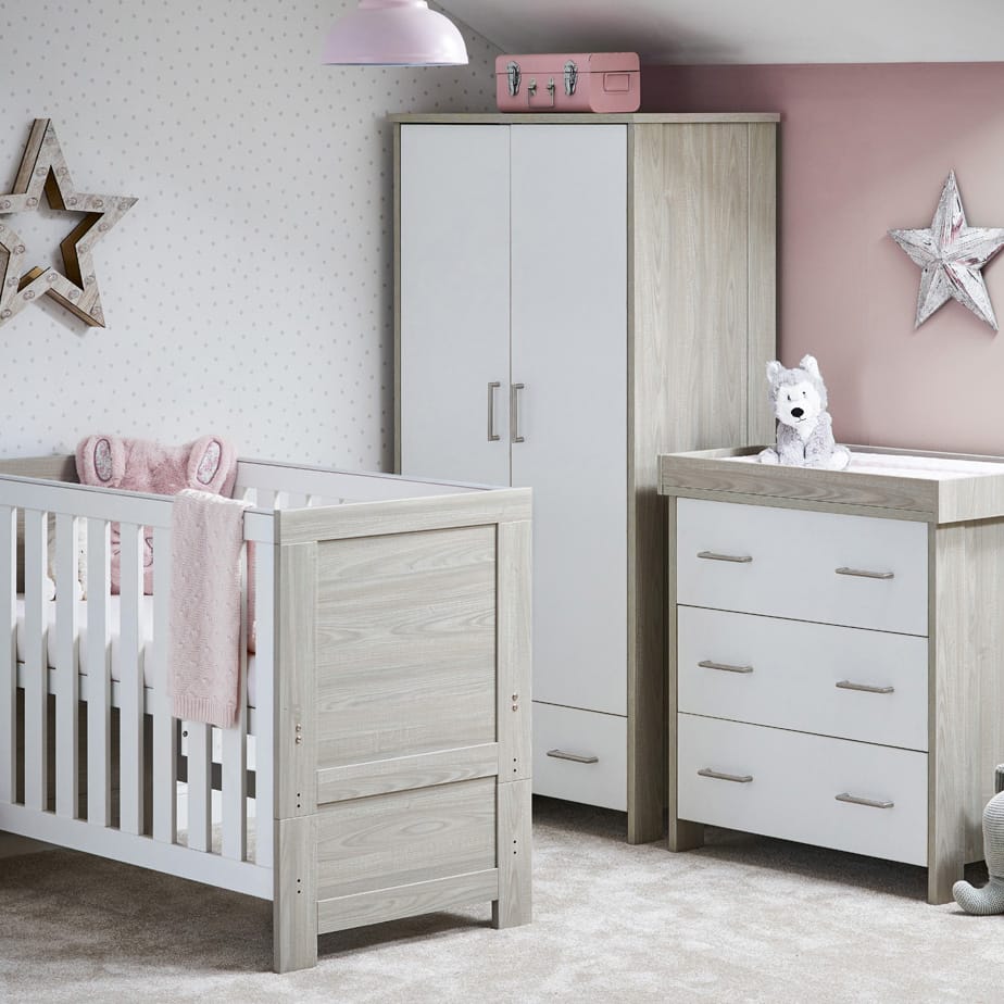 The Obaby Nika Collection offers a contemporary design, due to its clean lines and textured oak effect finish, that will fit perfectly in today’s modern nursery. This 3 piece room set consists of Nika Mini cot bed, changing unit and double wardrobe.
