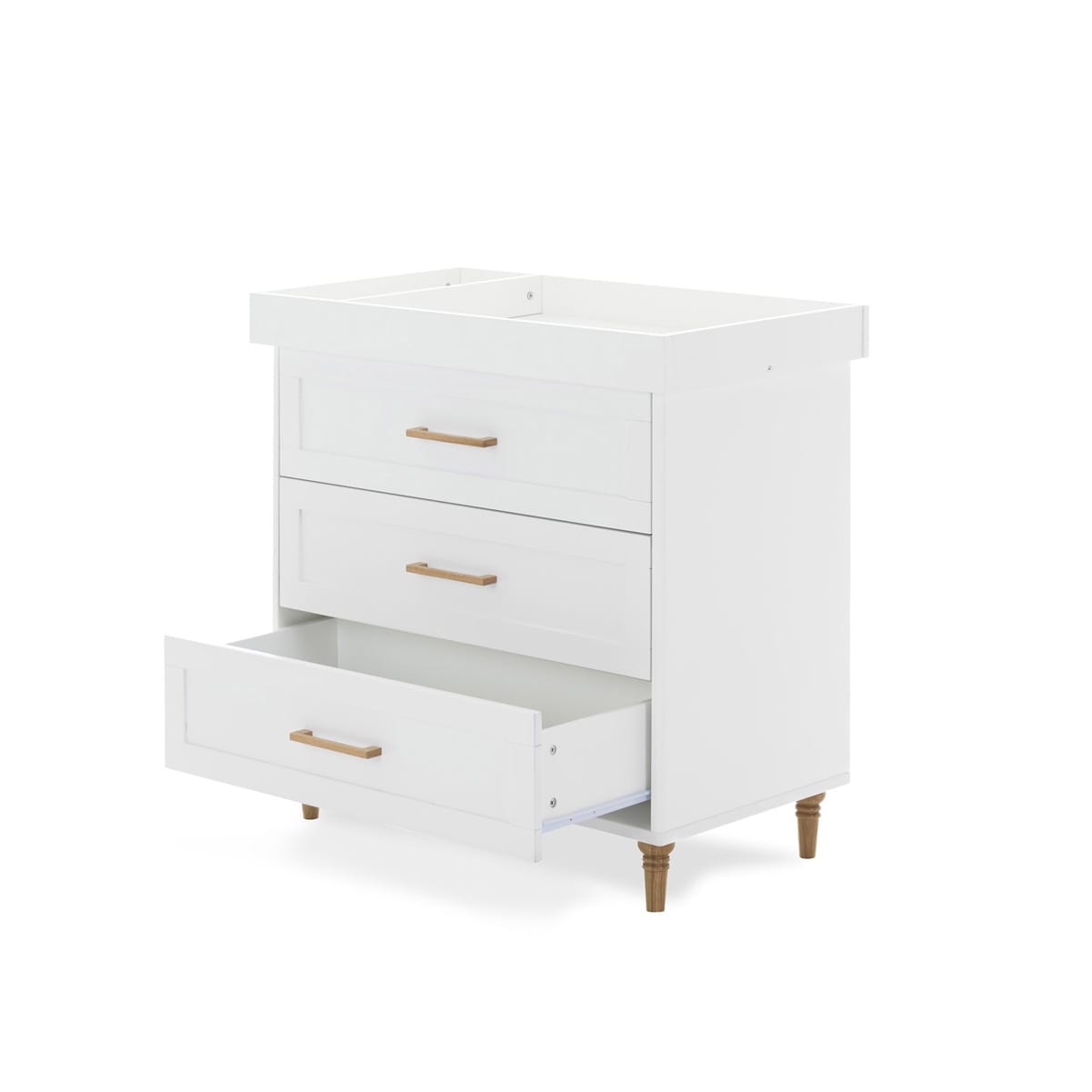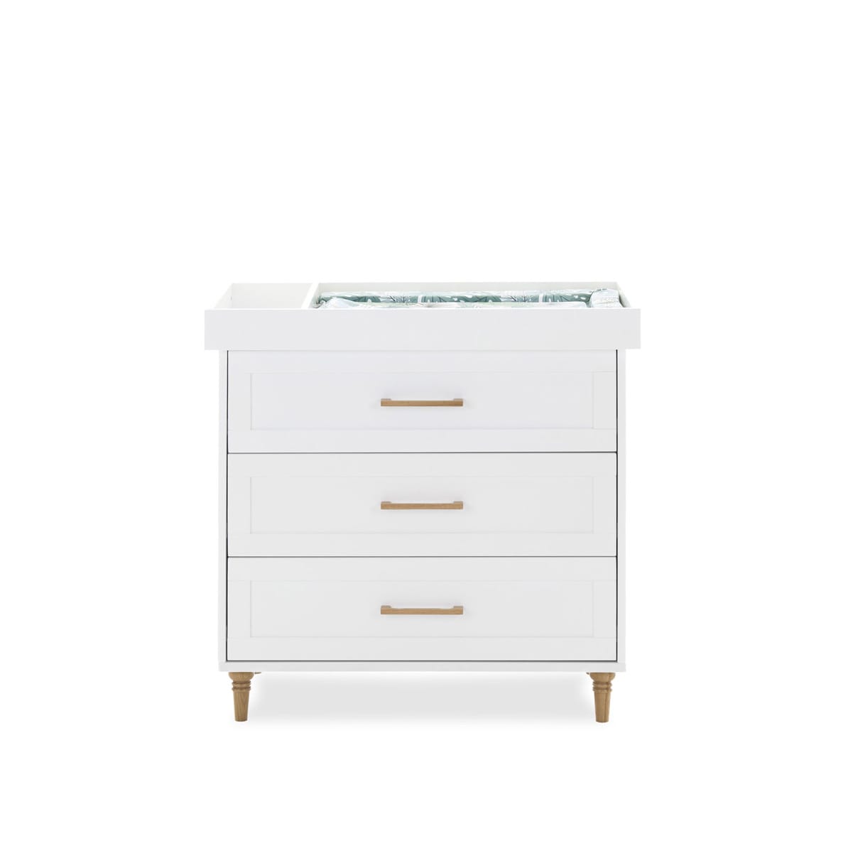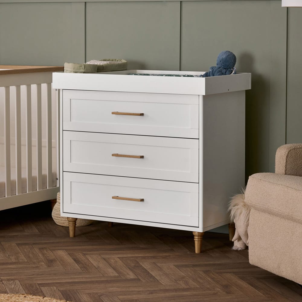 Its three spacious, Shaker-style drawers with natural wood handles provide ample storage for all the essentials you need daily, from nappies and swaddles to cute little outfits.