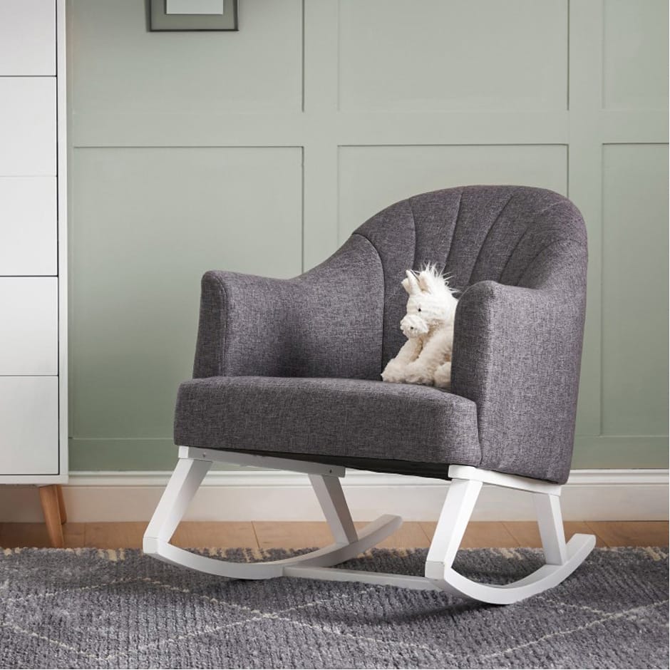 The solid wooden frame provides long lasting support while the deep foam seat and back cushioning envelopes you, providing the maximum in comfort. The Obaby round back rocking chair is designed to fit into any nursery setting due to its soft and durable weaved upholstery in a neutral shade of grey.