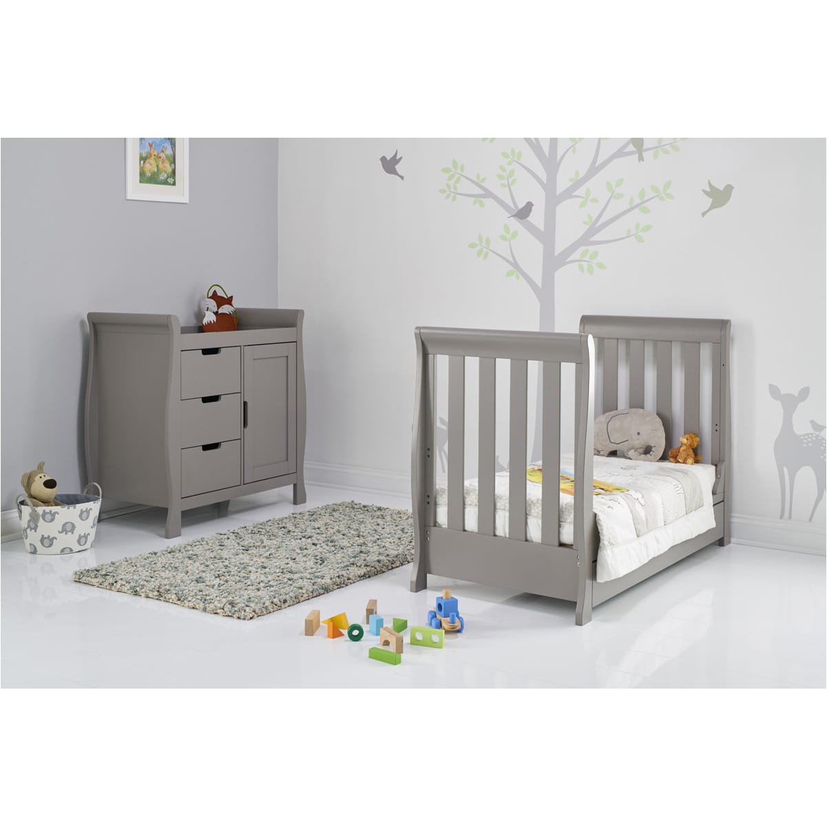 The Obaby Stamford furniture collection offers families the perfect combination of style, quality and practicality. The Stamford Mini 2 piece room set consists of the beautiful Stamford Mini cot bed with under drawer and closed changing unit. Both pieces feature the same elegant sleigh design that flows through the rest of the Stamford collection.
