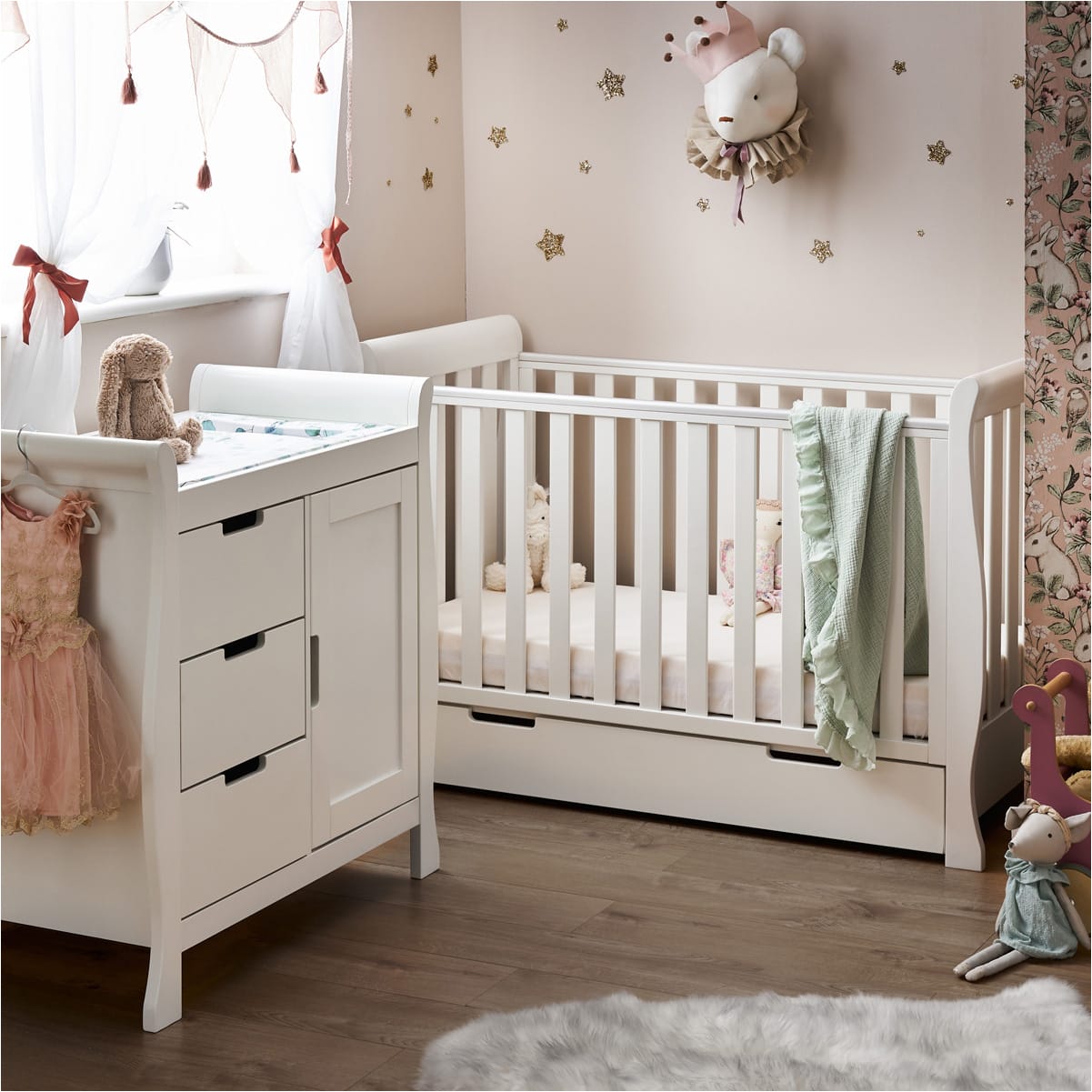 The Obaby Stamford furniture collection offers families the perfect combination of style, quality and practicality. The Stamford Mini 2 piece room set consists of the beautiful Stamford Mini cot bed with under drawer and closed changing unit. Both pieces feature the same elegant sleigh design that flows through the rest of the Stamford collection.