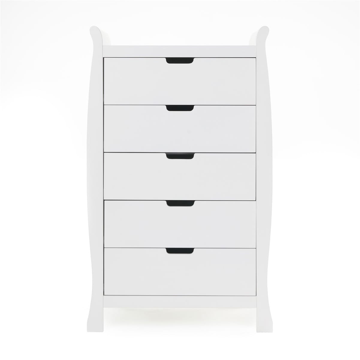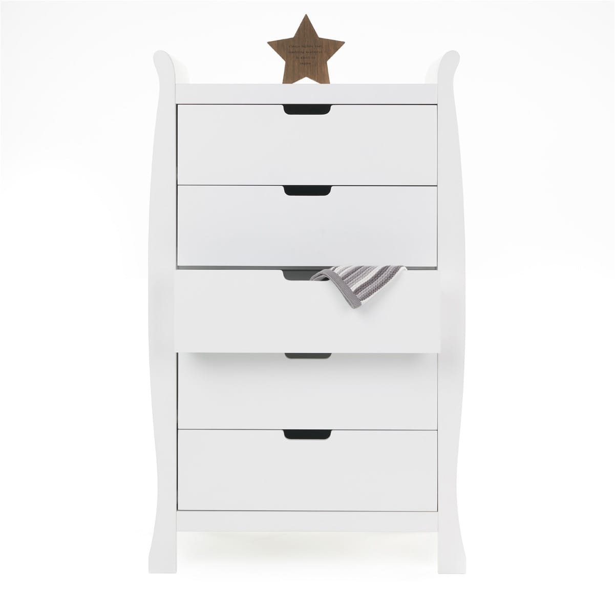 The tall chest of drawers consists of five 24L capacity drawers meaning there is plenty of space to store your little one’s adorable outfits. Smooth gliding runners allow the drawers to be moved effortlessly and the stylish recessed handles ensure that it is snag free and simple to use. The solid constructed top offers the ideal place for cherished photos and precious belongings while the elegant sleigh design coordinates perfectly with all of the other pieces in the Stamford furniture Collection.