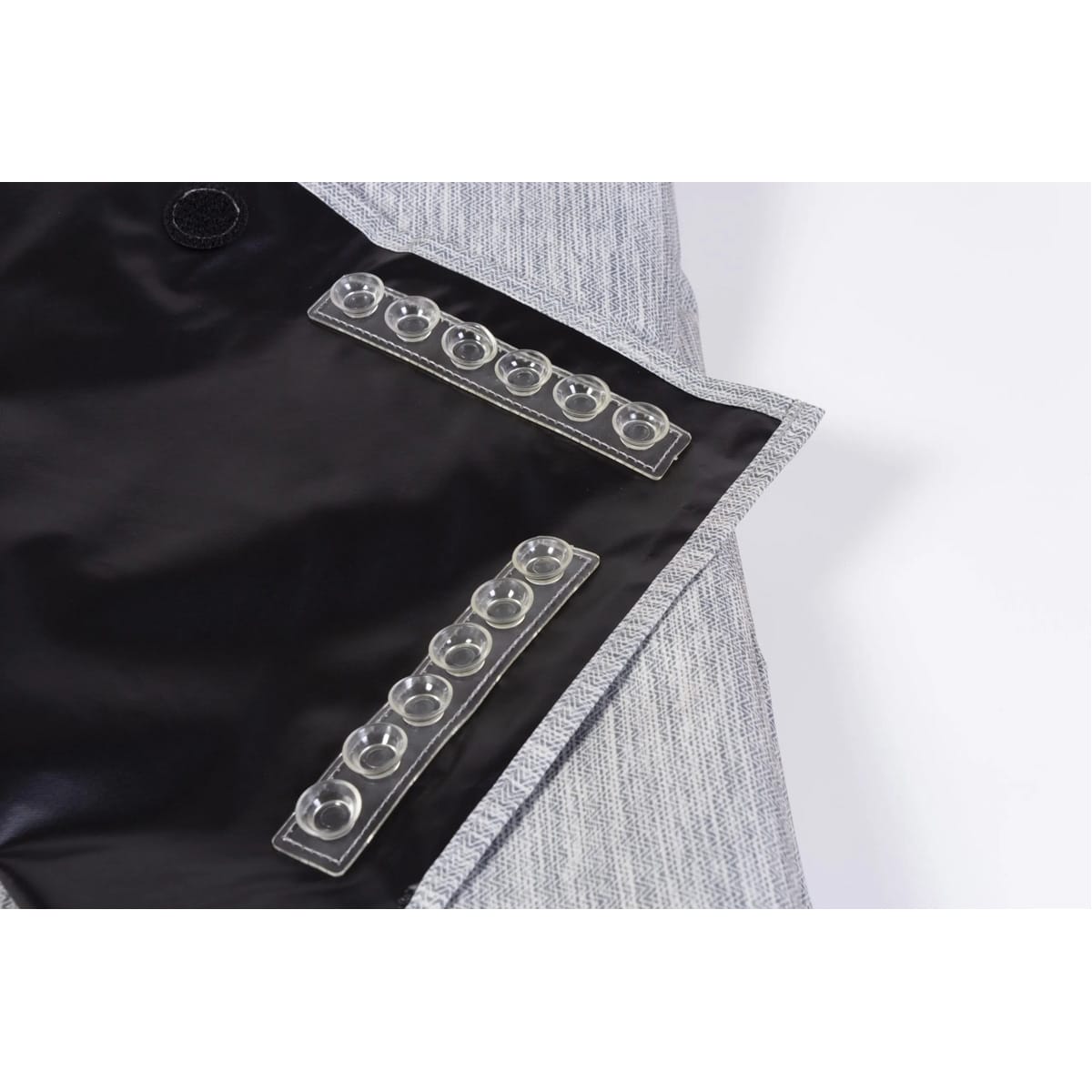 Made from a soft herringbone printed facing material to suit all decor, the back has over 100 suckers on easy-fit strips to adhere quickly and securely to your window. The blind can be made bigger or smaller with the velcro pads and there’s an integrated pocket to pack the product away for easy storage and travel.