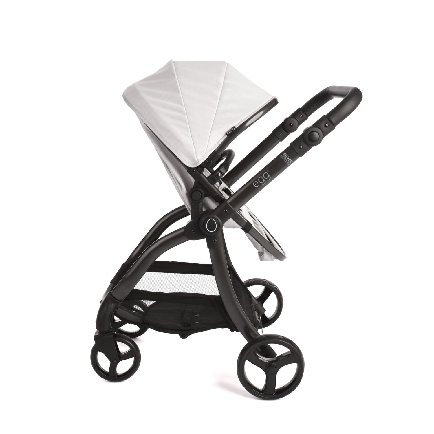 Included in the box is a coordinating apron for use in carrycot mode. The fabrics are the same stunning Feather colourway found on the full size egg2 stroller. Finished on a gloss champagne chassis with cocoa leatherette hand-stitched handle bar.