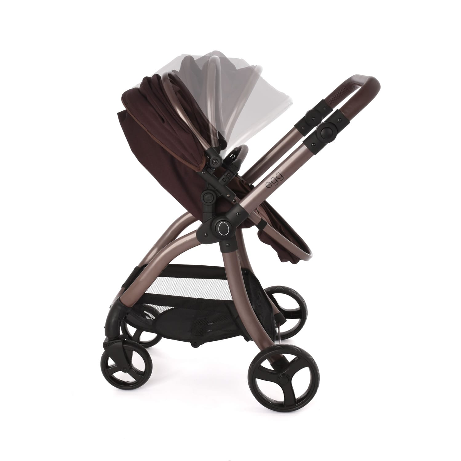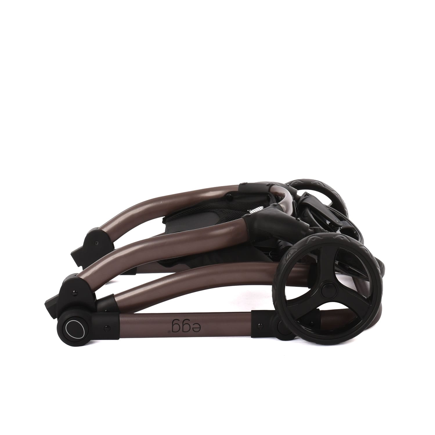 Included in the box is a coordinating apron for use in carrycot mode. The fabrics are the same stunning Feather colourway found on the full size egg2 stroller. Finished on a gloss champagne chassis with cocoa leatherette hand-stitched handle bar.