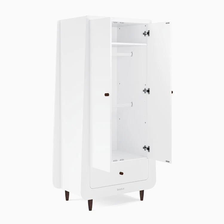SnuzKot Skandi Wardrobe – White/Ebony features adjustable shelving and rails, a spacious interior, and a large drawer perfect for bedding or essentials.