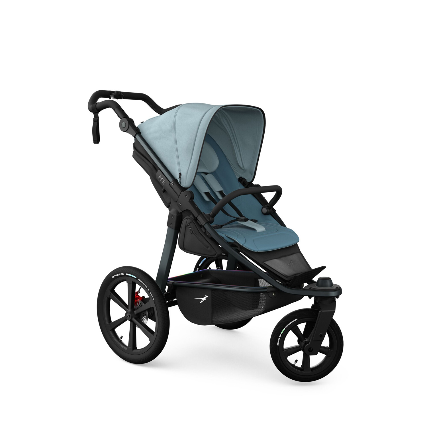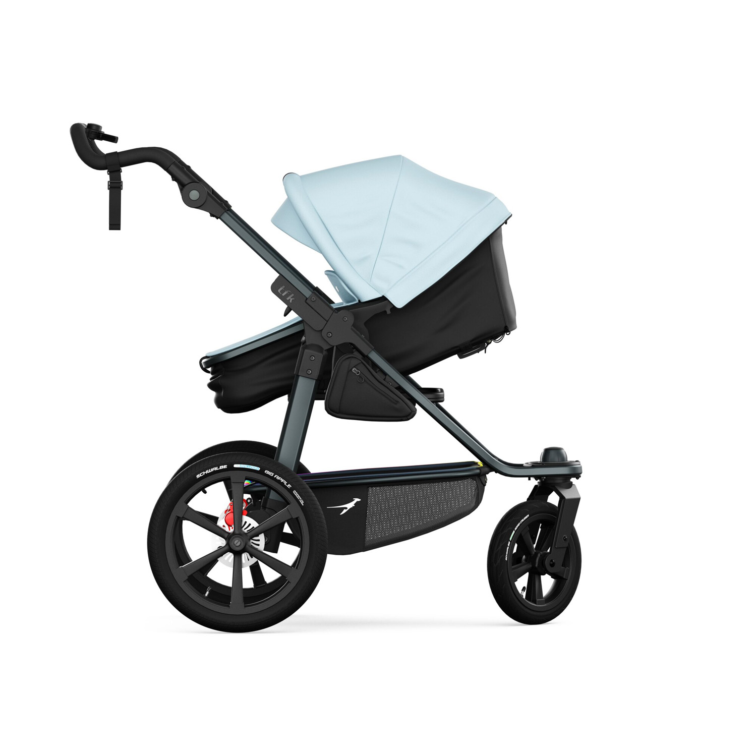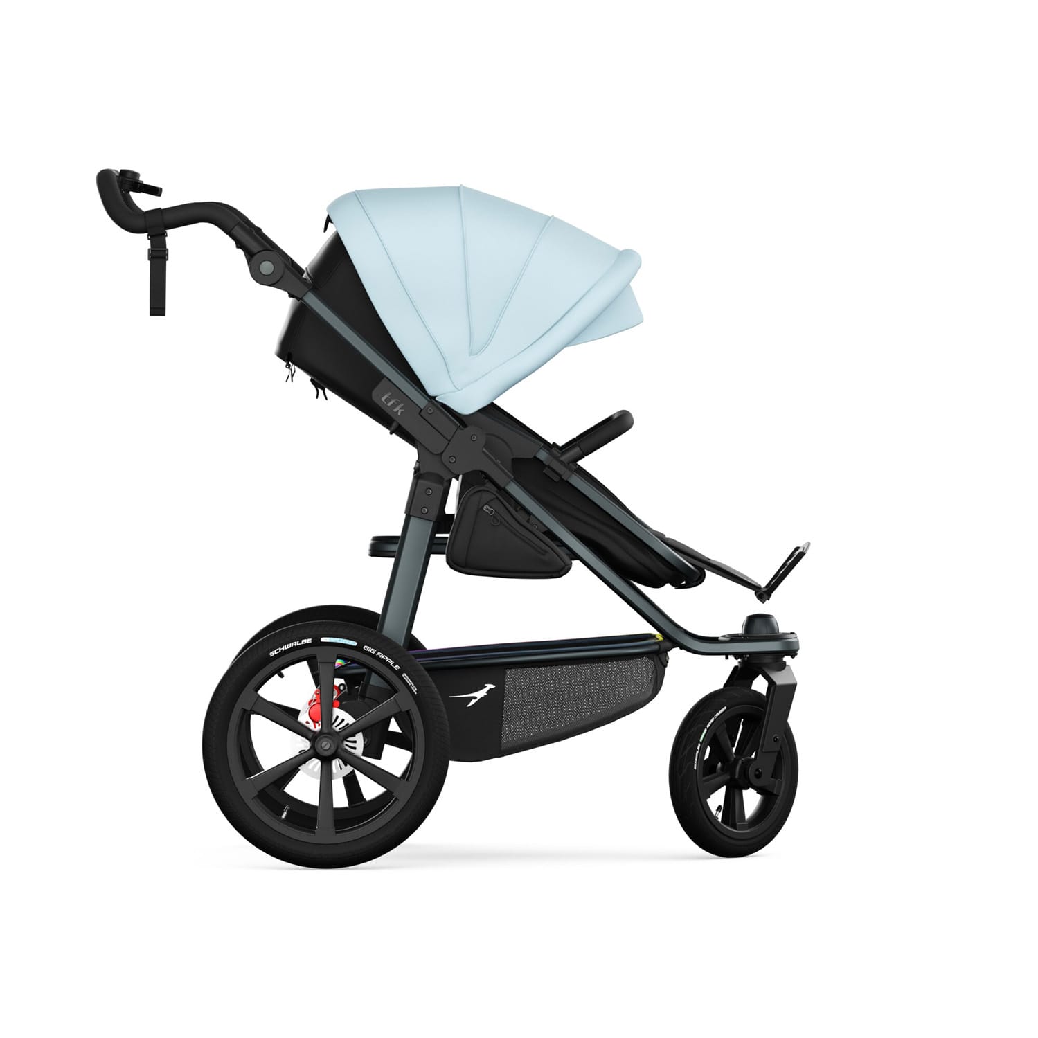 The new tfk pro has been specially developed and designed for all sporty parents who value the highest quality paired with well-thought-out features and excellent running and driving characteristics. Every detail is designed not only to offer maximum comfort for the child, but also for the parents, making every run a highlight. The ergonomic push handle makes pushing easier, especially on longer runs, and reduces strain on the arms. The combination of 16‘ rear tyres and 12’ front wheels, adjustable straight-line stability and a lightweight aluminium frame ensures a feather-light ride. The completely redesigned braking system, consisting of integrated hand and parking brakes and disc brakes, enables fast, safe and precise braking even at higher speeds. In short, the tfk pro offers that ‘extra pro’ for all runners and sporty parents, combining ultimate comfort and style!