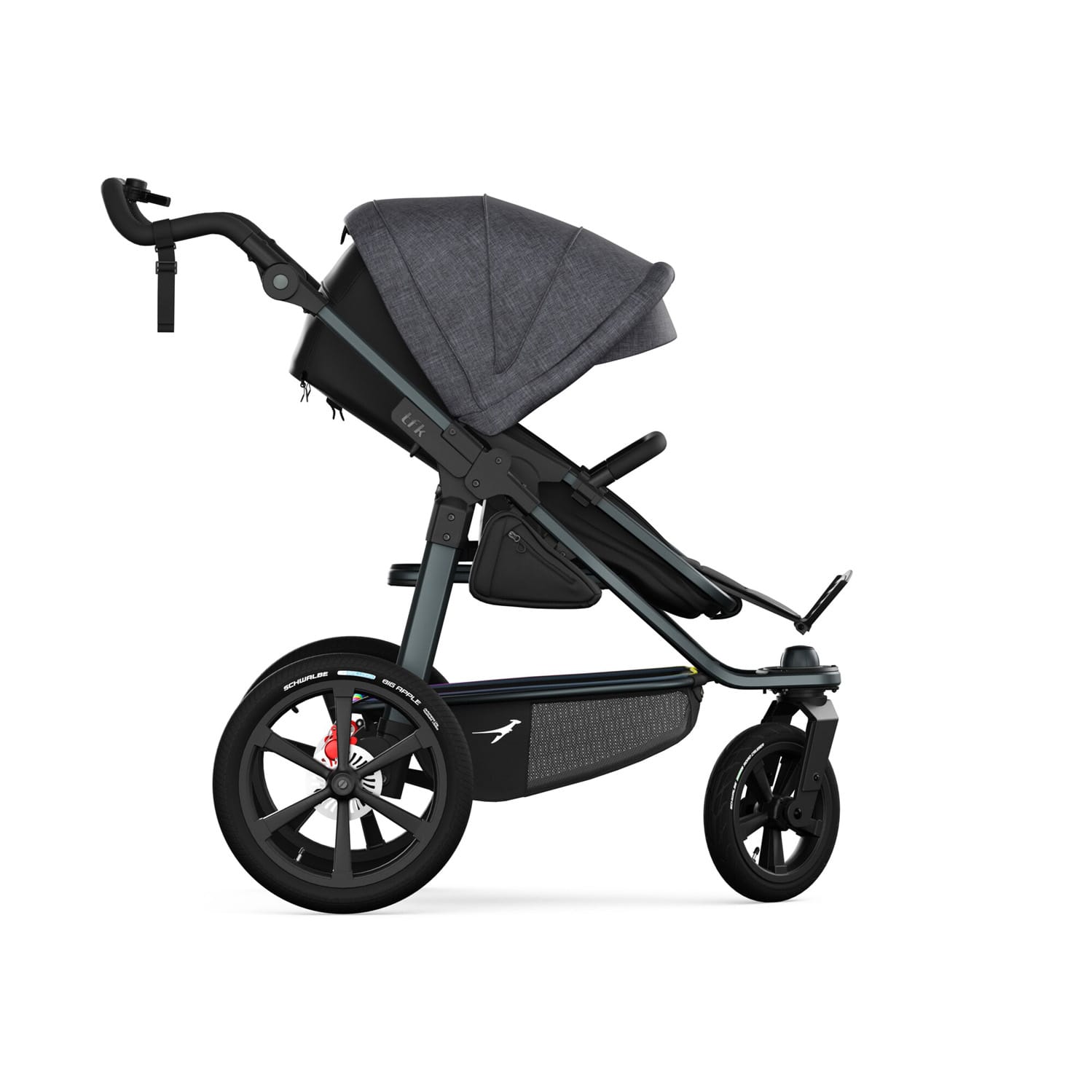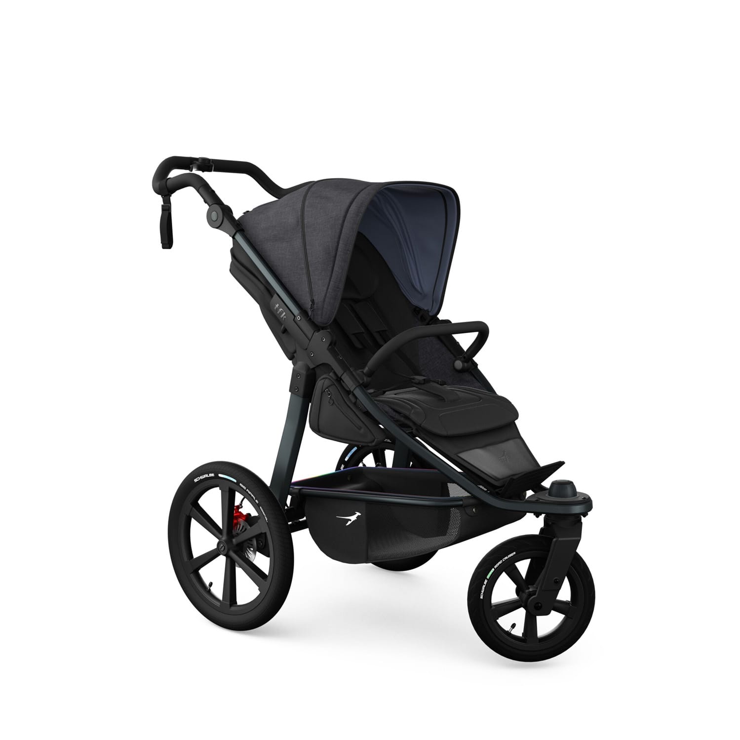The new tfk pro has been specially developed and designed for all sporty parents who value the highest quality paired with well-thought-out features and excellent running and driving characteristics. Every detail is designed not only to offer maximum comfort for the child, but also for the parents, making every run a highlight. The ergonomic push handle makes pushing easier, especially on longer runs, and reduces strain on the arms. The combination of 16‘ rear tyres and 12’ front wheels, adjustable straight-line stability and a lightweight aluminium frame ensures a feather-light ride. The completely redesigned braking system, consisting of integrated hand and parking brakes and disc brakes, enables fast, safe and precise braking even at higher speeds. In short, the tfk pro offers that ‘extra pro’ for all runners and sporty parents, combining ultimate comfort and style!