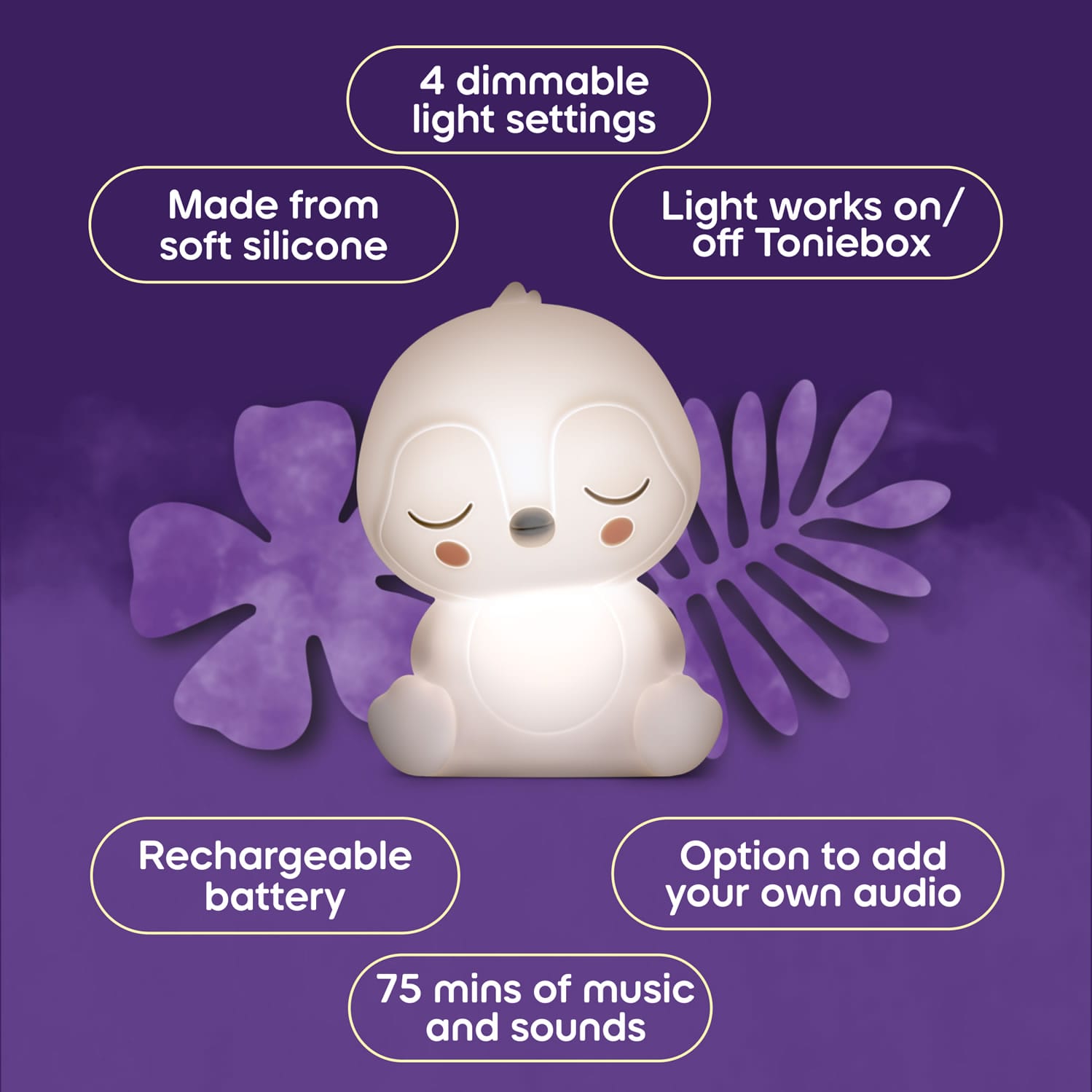Make bedtime dreams come true with this Sleepy Friends Sleepy Penguin Night Light. With 75 minutes of beautifully composed melodies featuring strings and bird song and four dimmable light settings that work on or off their Toniebox, little sleepy-heads will be off to the land of nod in no time.