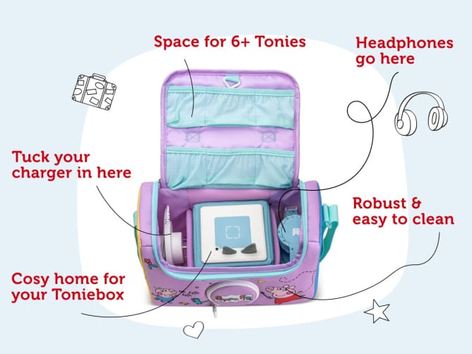 There’s even a flap so they can open up the speaker for songs and stories on-the-go. The bags are robust and easy to clean, with padded dividers and mesh pockets to keep everything snug as a tonies® bug.