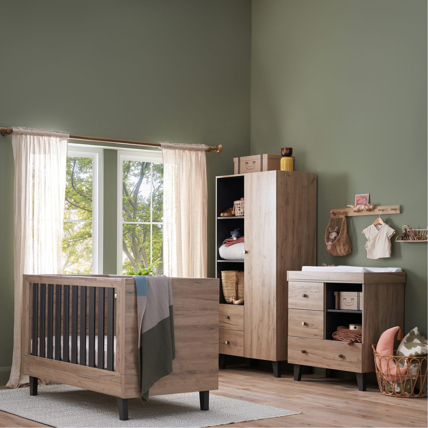 The Tutti Bambini Como 3 Piece Room Set in Distressed Oak and Slate Grey blends clean lines with contrasting finishes for a modern yet earthy nursery style.